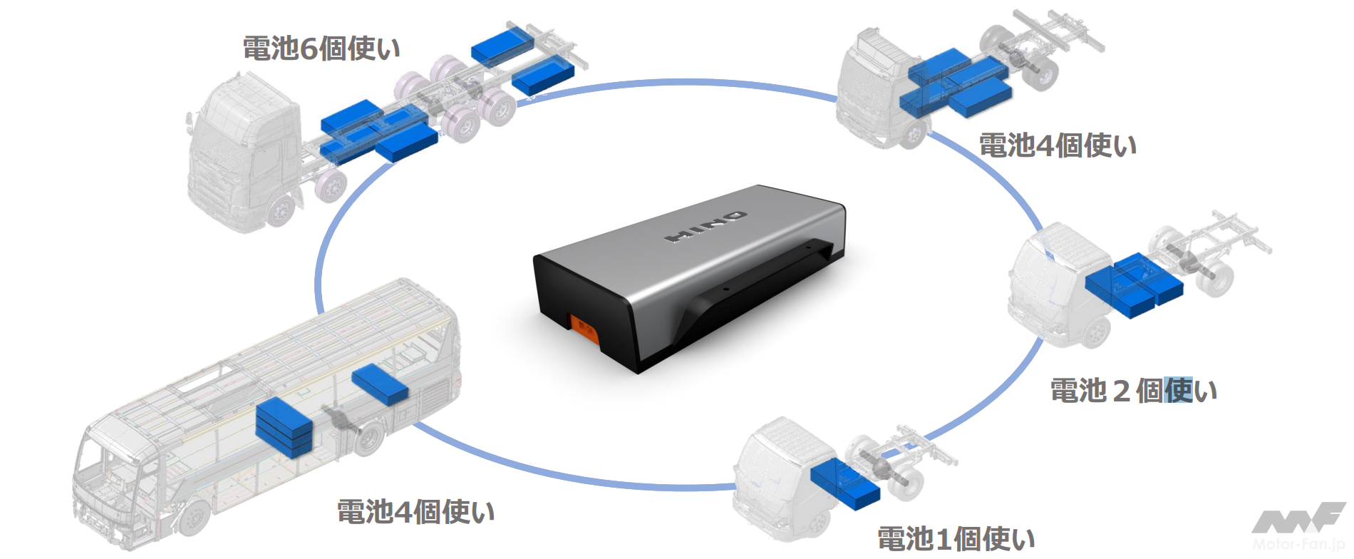 RE-BEVプラットフォーム構想における搭載電池パックは、様々な用途・車型の必要エネルギーにより標準化されているため、バッテリーセルの技術進化を制約することなく、普遍的な構造で汎用性を維持することができる。トレーラー、バス、小型・中型トラックなど、クルマの車格に合わせて電池の搭載個数を変更するなどして、設計を変えることなく普遍的に使いやすいモジュール構想となっている。