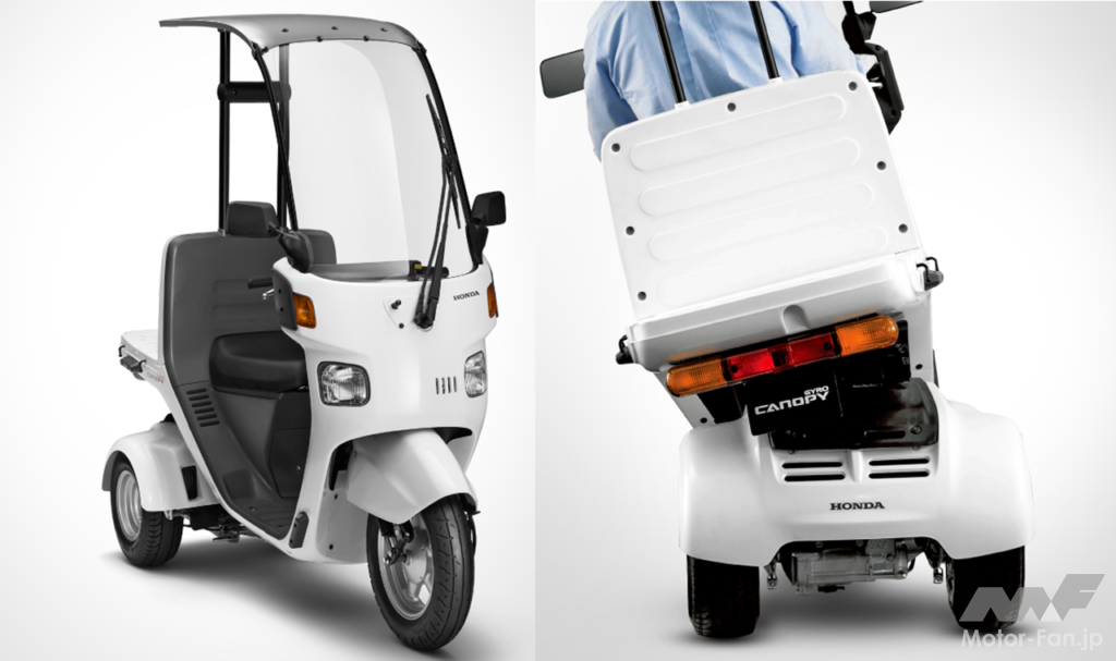 宅配車として人気の三輪バイク、ホンダ ジャイロキャノピー。コーナリング時は、運転席&ハンドル部のみ傾斜するシステムを採用。