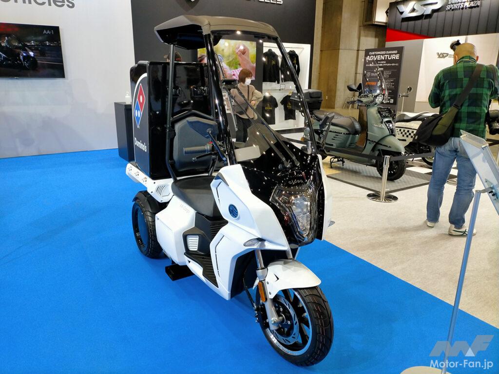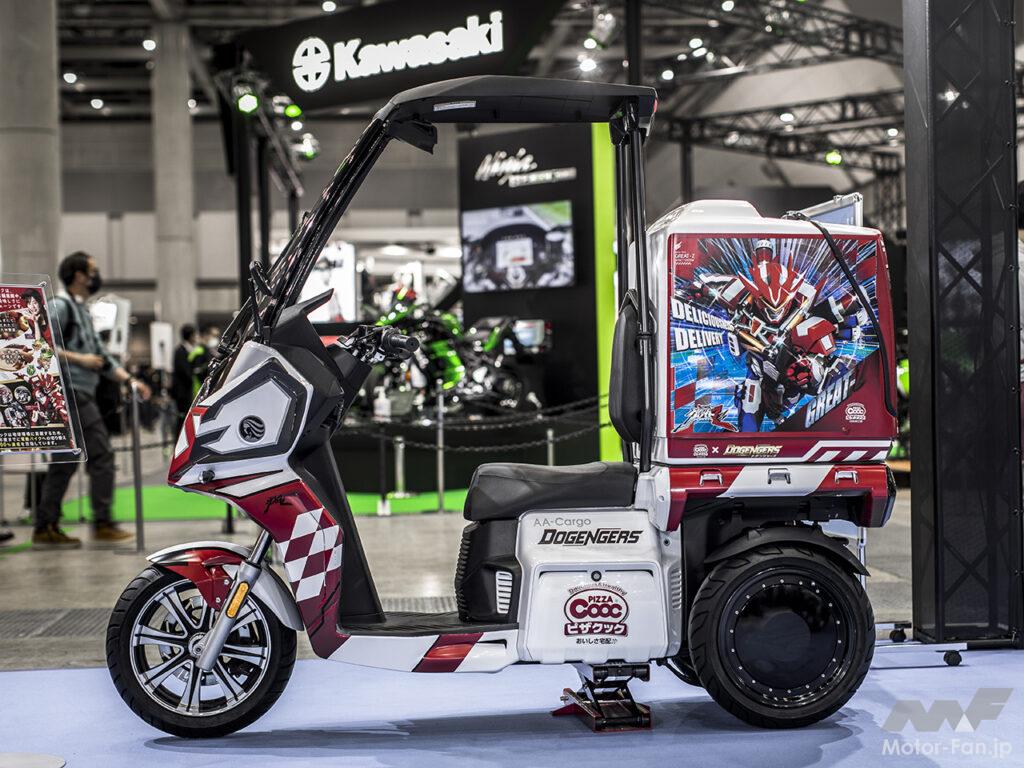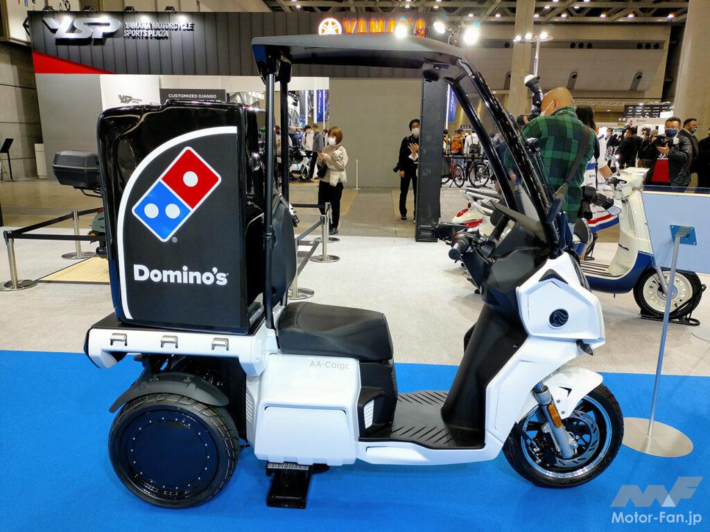写真はアイディアの量産第一号モデルとして、デリバリー用途に最適なルーフ(屋根)を採用した電動三輪スクーター「AAカーゴ」。コロナ禍による新しい生活様式の転換も手伝い、販売台数は上昇。また、日本郵便による郵便配達車に加え、日本マクドナルドやドミノピザなども宅配車として採用するなど、各種デリバリー業界の需要も高まっている。