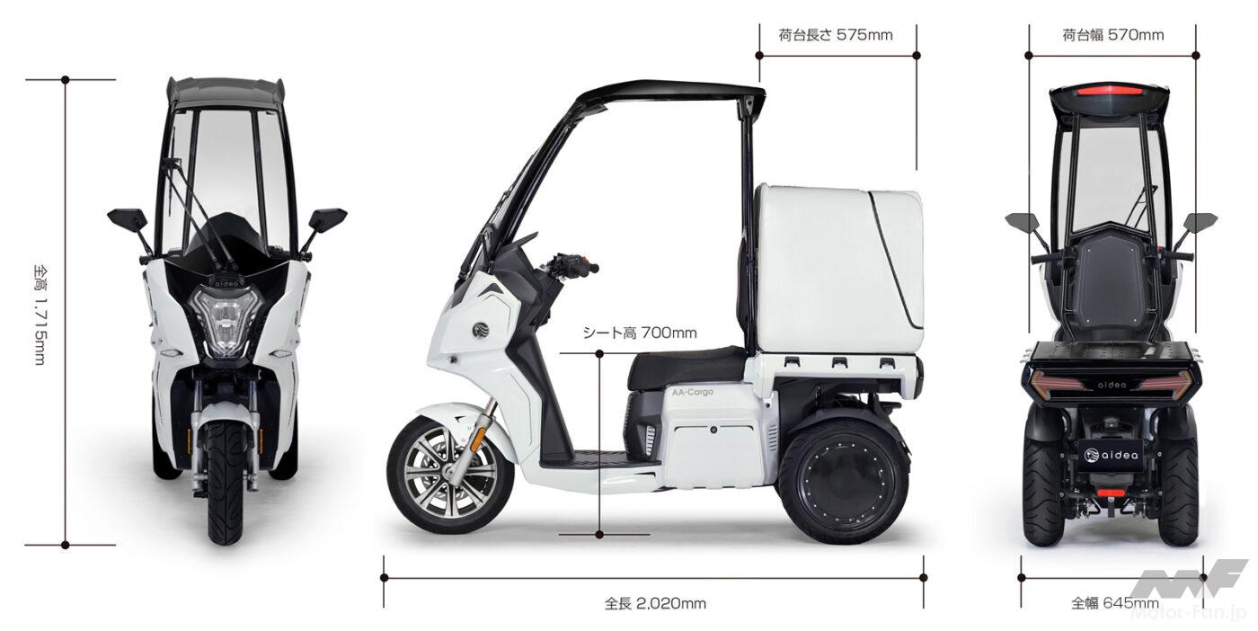 AAカーゴは安定性の高い、フロント1輪・リア2輪の3輪構造を採用。ワイパー&ウォッシャー機能付きの大型スクリーン、大型のルーフ、様々なボックスに対応するフルフラットな荷台が導入されている。