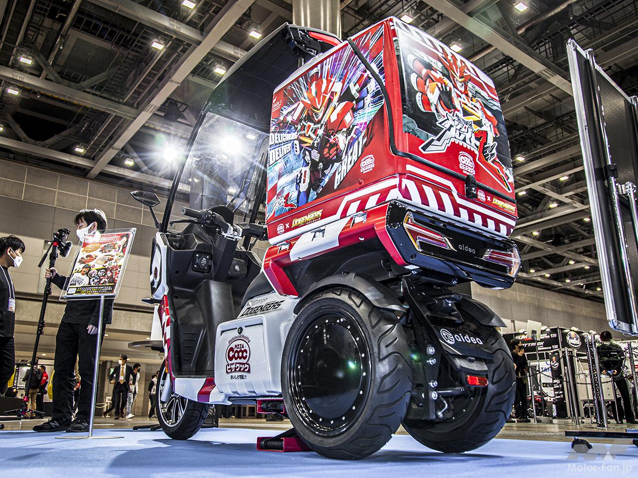 写真はアイディアの量産第一号モデルとして、デリバリー用途に最適なルーフ(屋根)を採用した電動三輪スクーター「AAカーゴ」。コロナ禍による新しい生活様式の転換も手伝い、販売台数は上昇。また、日本郵便による郵便配達車に加え、日本マクドナルドやドミノピザなども宅配車として採用するなど、各種デリバリー業界の需要も高まっている。