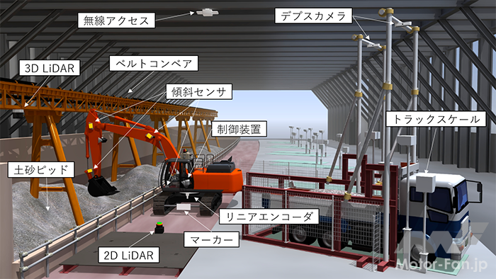 今回、従来は人手で行っていた作業を自律運転で実施するため、センサを活用してピット内の土砂形状をもとに土砂を最適な位置にかき寄せる機能や、掘削したバケット内の土砂体積を推定する機能を開発し制御に組み込むことで、搬出時の総重量を目標値の98~100%の精度で積載することができた。加えて、バックホウの動作を高精度に制御することで、正確な掘削作業と公道運搬に適した荷姿に整形するなど、一連の作業を通じて、単に同じ動作を反復するのではなく、人手と同等の作業を実現した。また、ベッセル(荷台)の形状を深度カメラで認識し積み込みを制御することで、あらゆる形状のダンプトラックに適応できる。