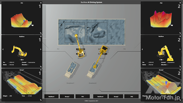 3社は2019年に、センシング技術とそれらを統合管理する「ネットワークドコントロールシステム(注1)」や、NECの「適応予測制御技術(注2)」、大林組と大裕が共同で開発したメーカや機種を問わず対応が可能な汎用遠隔操縦装置「サロゲート」を活用したバックホウ自律運転システムを開発した。今般、建設現場に適用するための機能を拡張のうえ、大林組が施工するトンネル現場において、複数台の異なるメーカのバックホウが、土砂ピット内に堆積した土砂を掘削しダンプトラックに積み込む一連の作業を、自律運転にて実施した。また、自律運転中は、遠隔地から1人のオペレータが監視し、いつでも遠隔操縦に切り替えられる体制を整備することで、バックホウに搭乗するオペレータの省人化を実現した。