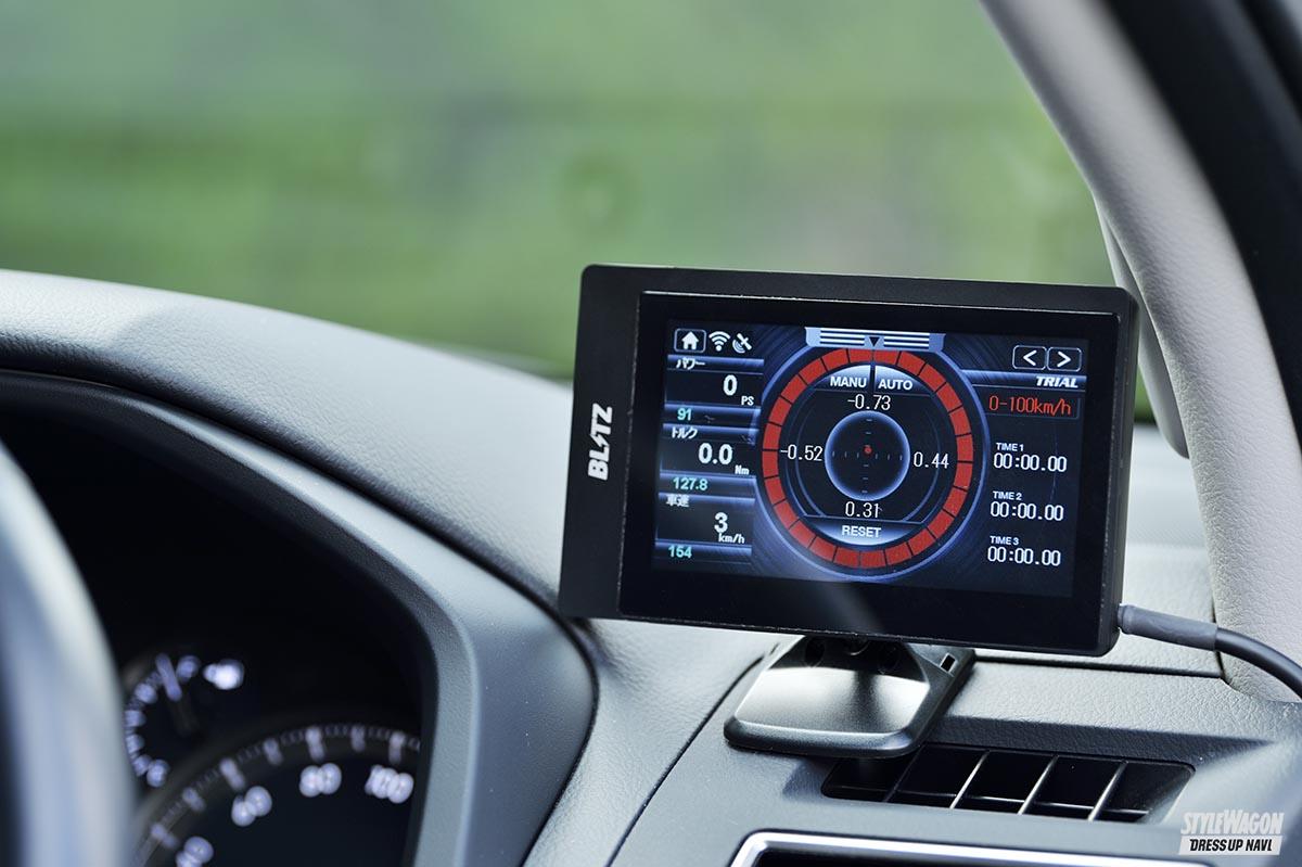 故障診断コネクターに接続するだけで、様々車両情報が見られるようになる『タッチブレインプラス』。車速や燃費、パワー&トルクなど90項目に達する充実ぶりだ。さらにラップ計測/タイムトライアル機能も備え、たとえば自宅から会社や学校までの時間の計測もできる。