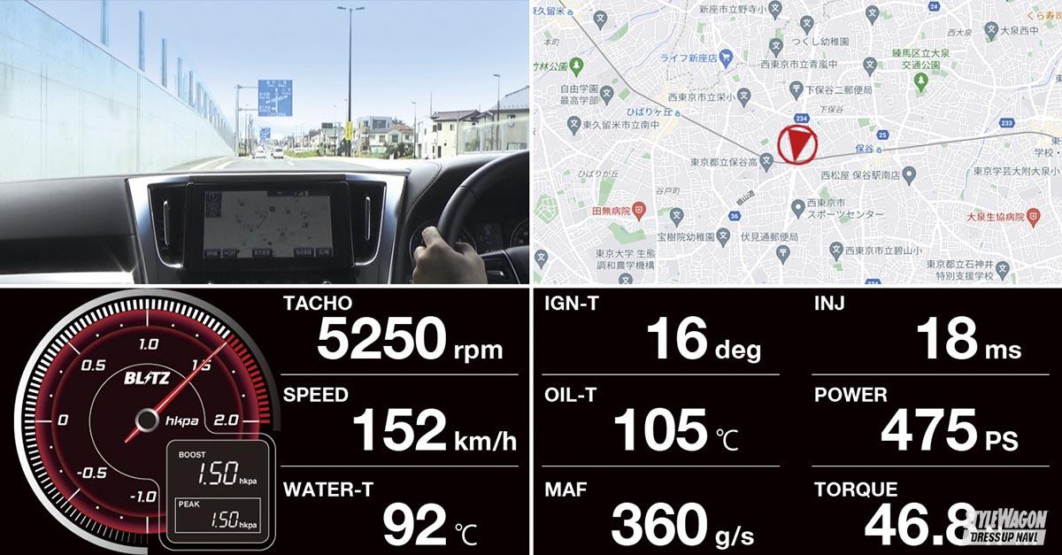 さらに注目は、今までなかったドライブログ&SNSシェア機能を備えていること。手持ちのスマホに専用アプリをインストールしておいて、ドライブ映像を録画しておけば、タッチブレインプラスで取得した車両ログデータとGPS情報から得たマップデータを、簡単に合体できる。