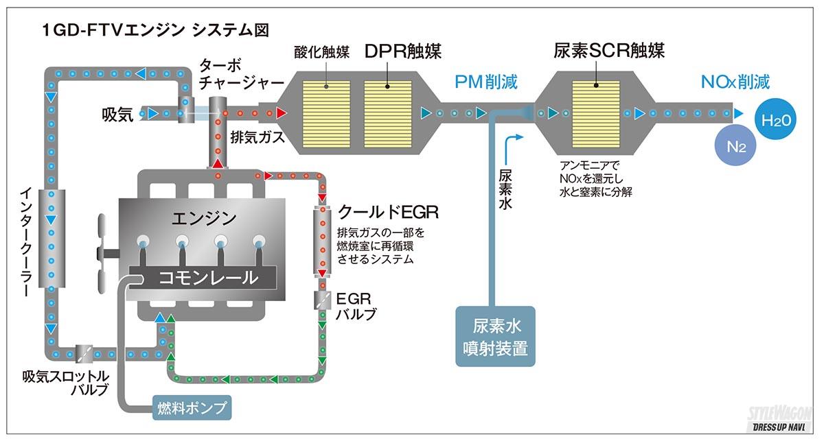 環境性能にも秀でているのも、1GD-FTVの特徴のひとつ。トヨタ初となる尿素SCRシステムの採用などによって、世界でもっとも厳しい排出ガス規制である欧州のEURO6および、日本のポスト新長期にも対応していることはトピックのひとつだ。
