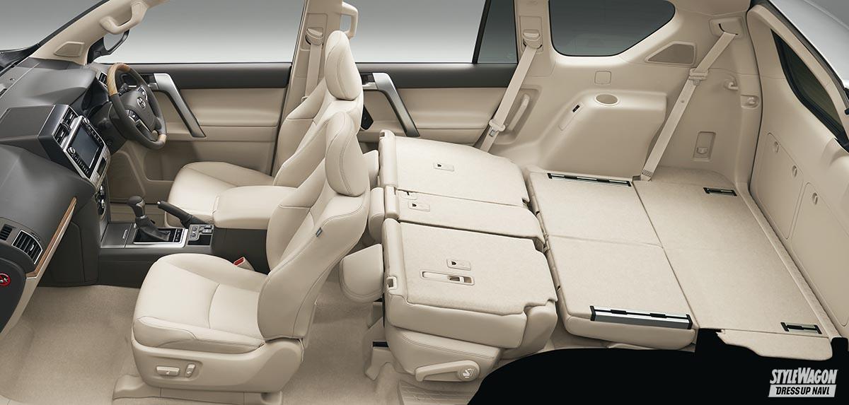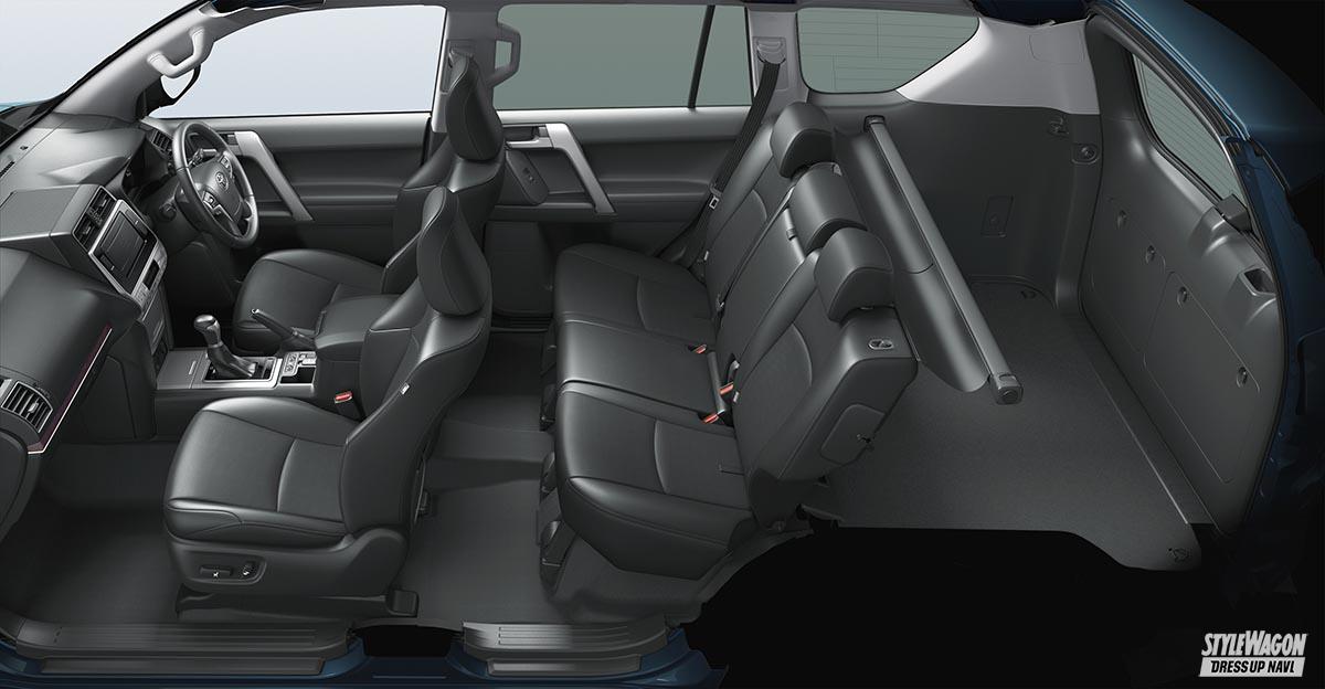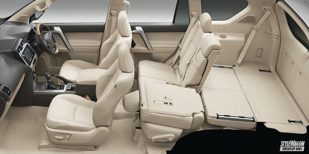ランドクルーザープラドの車内は、外装で表現した力強い造形を継承した作りがなされている。クロカンSUVならではのタフさを表現しながら、プレミアムSUVのような豪華さが漂う。ステアリングホイールは握りやすさを考慮した設計としたほか、専用加飾を施すことでインストルメントパネルとの統一感を演出。質の高さと優れた機能性を高い次元で両立している。