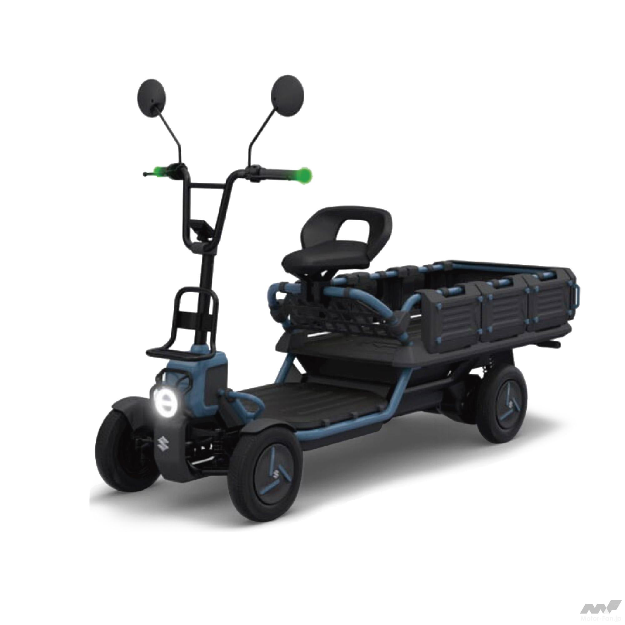 電動モビリティベースユニットは、スズキがこれまで培ってきた電動車いすの技術が応用されている。電動車いすの足回りベースユニットに自律走行システムを搭載することで、農業、配送、土木建設補助など様々な用途で活用できるロボットの足回りとして展開することを想定している。