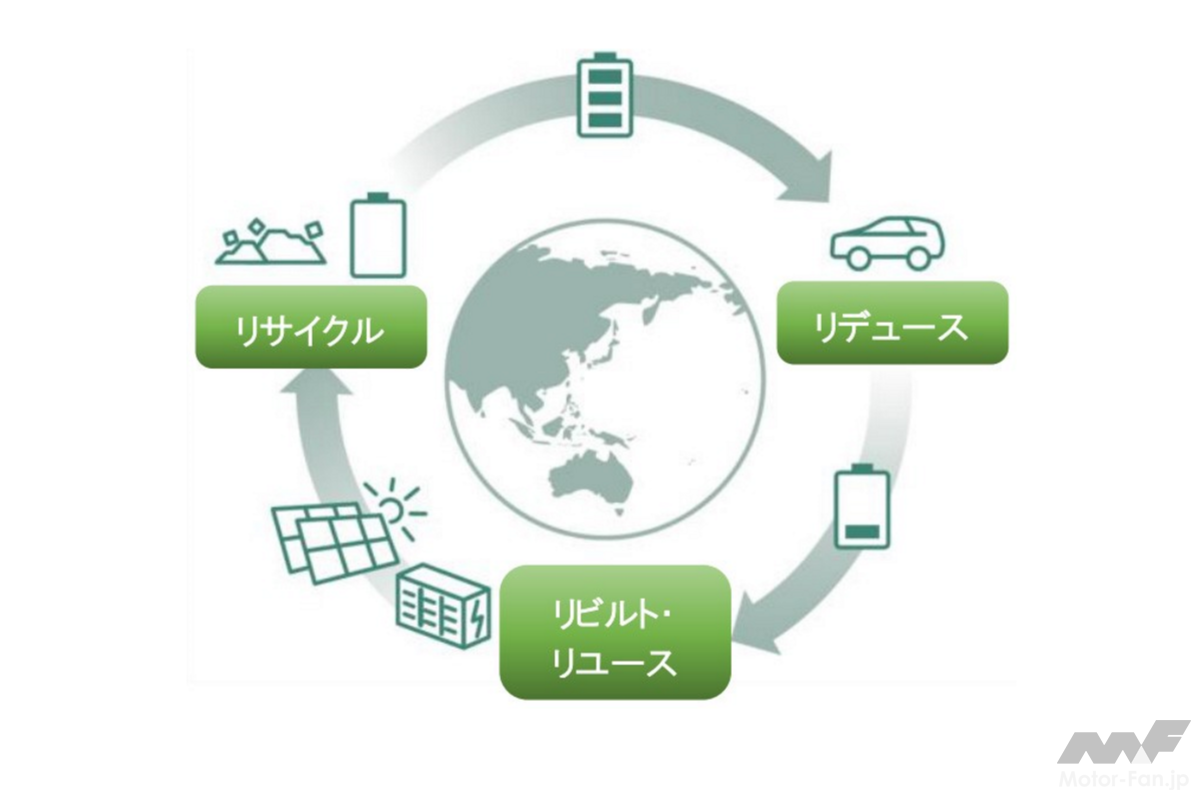 トヨタは、電動車バッテリーにおいては、省資源でできる電池の開発や長寿命電池を開発し、ドライバーが長期間使用したのち、リビルト・リユースし、最後にCO2排出量の少ない方法でリサイクルを行うといった「電池3R(①リデュース ②リビルト・リユース ③リサイクル)」の考えのもと、限りある資源を大切に使う取り組みに着手している。