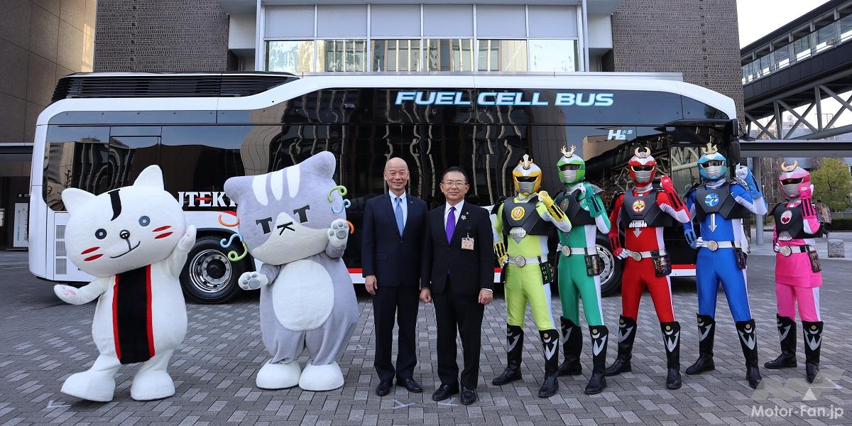 岡崎市役所で開催された通勤用FCバスお披露目会 左からジェイテクトマスコット・ジェイにゃん、テクニャン、経営役員・立花 昭人経営管理本部本部長、 岡崎市・中根 康浩市長、未来環境創造戦士・エコマンダー