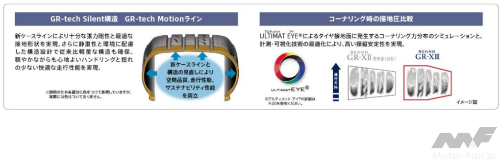 新商品「REGNO GR-XⅢ」は、1981 年の登場以来一貫して提供してきた「REGNO」ブランドの価値であるGREAT BALANCEを、「ENLITEN」技術を搭載することで新たな次元へ進化させ、”新たな REGNO FEELING”の提供を可能としている。「REGNO」のコア・コンセプトである静粛性に加え、ハンドリング性にもエッジを効かせることで、“静か、やわらか、安らか、気持ちよい、滑らか”という”REGNO 史上かつてない空間品質”と”質の高い乗り味”を両立した新しい”REGNO FEELING”を「ENLITEN」による「究極のカスタマイズ」※3 で実現している。ブリヂストンは、顧客により深みを増した空間品質による静粛性や、磨き抜かれた走行性による走りそのものを楽しむことを体感いただけるものと考えており、国産車はもちろんのこと、輸入車や BEV(バッテリー式電気自動車)といった幅広い車種に“新たなREGNO FELLING”の価値が提供される。「REGNO GR-XⅢ」はブリヂストンの考えるプレミアム商品として提供される。