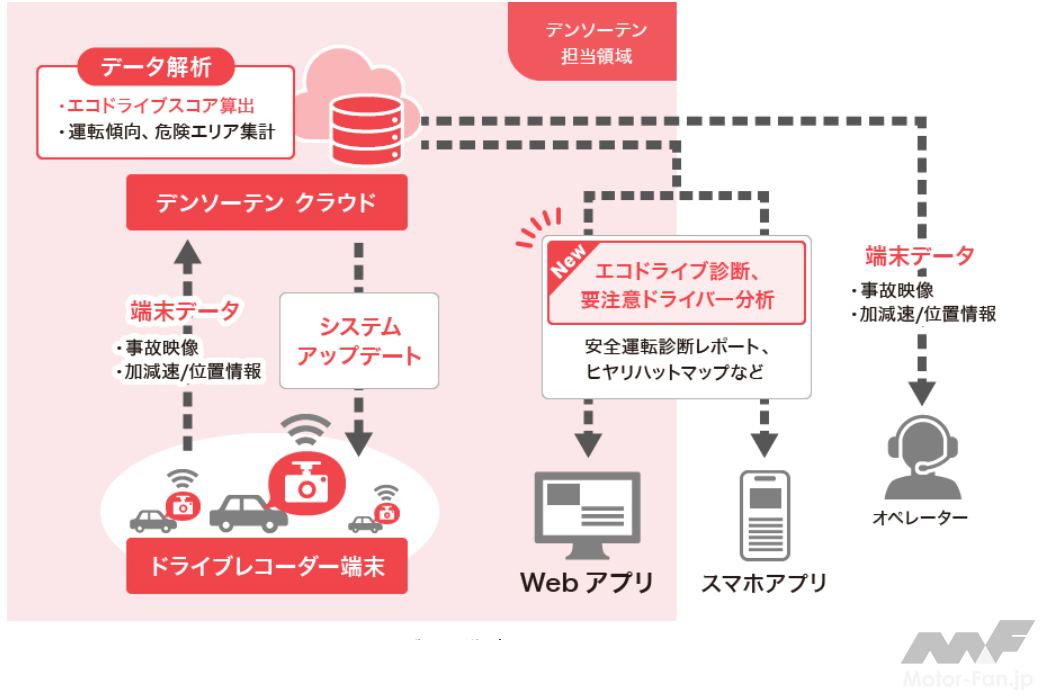 今回の機能拡張により、エコドライブの意識向上につながるWEBアプリ・スマートフォンアプリ向けの「エコドライブ診断」や、安全運転診断の点数が悪化しているドライバーを安全運転管理者へ通知する「要注意ドライバー分析」が追加される。