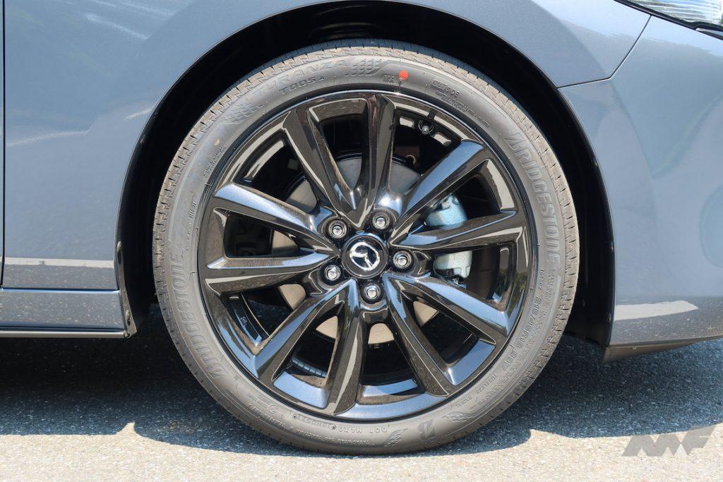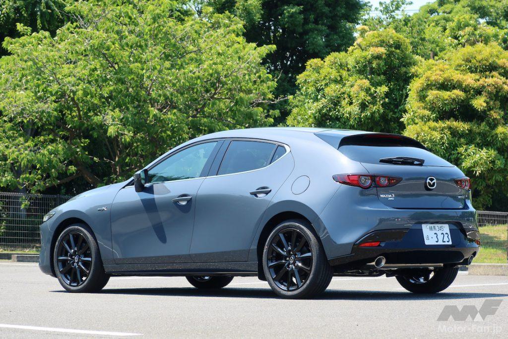 e-SKYACTIV-X搭載車専用の装備は、18インチサイズのアルミホイールがブラックメタリック塗装になることだ。1.5ℓと2.0ℓのガソリン、1.8ℓのディーゼルエンジン搭載車の18インチアルミはグレーメタリック塗装なので、そこが最大の識別点になる。大径マフラーカッターを備えるのもe-SKYACTIV-Xの特徴だが、ひと目で識別できた試しがない。一体どれほど大径なのだろう……。
