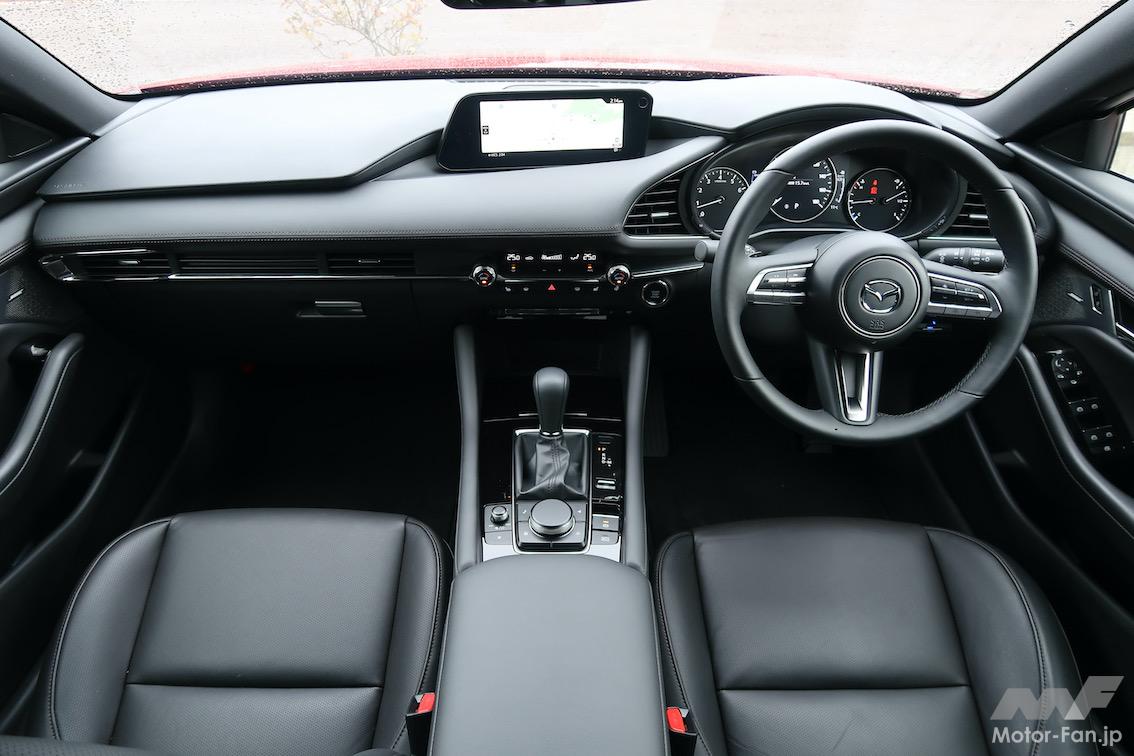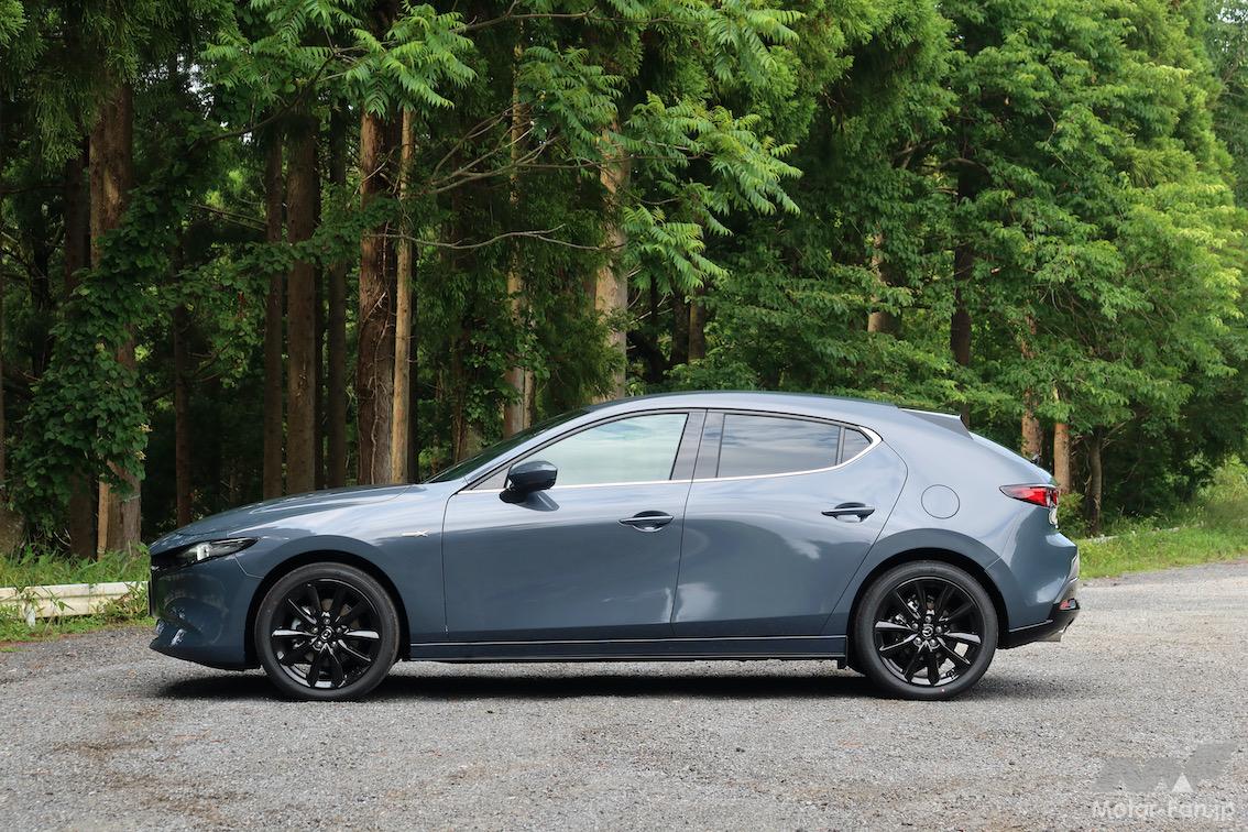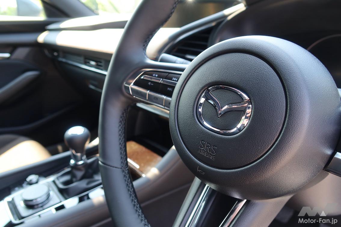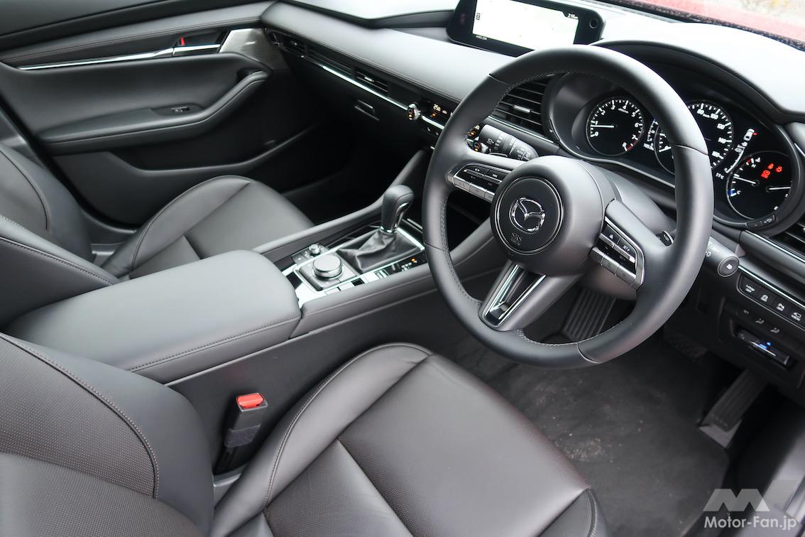 e-SKYACTIV-X搭載車専用の装備は、18インチサイズのアルミホイールがブラックメタリック塗装になることだ。1.5ℓと2.0ℓのガソリン、1.8ℓのディーゼルエンジン搭載車の18インチアルミはグレーメタリック塗装なので、そこが最大の識別点になる。大径マフラーカッターを備えるのもe-SKYACTIV-Xの特徴だが、ひと目で識別できた試しがない。一体どれほど大径なのだろう……。