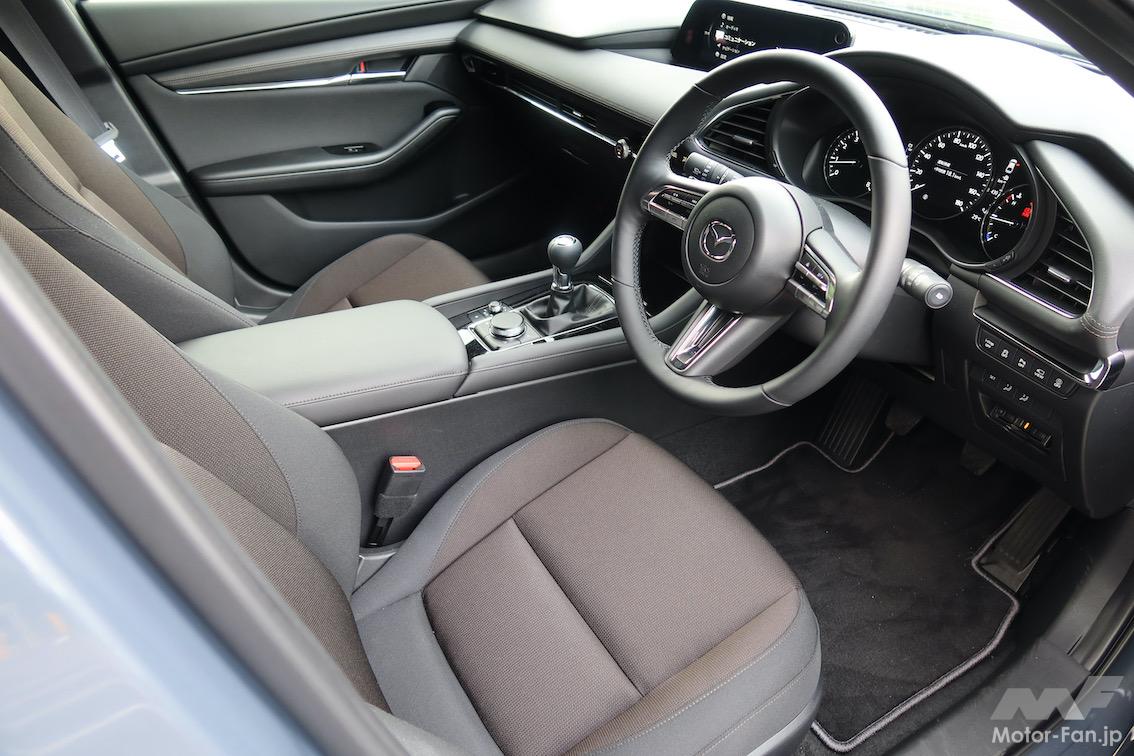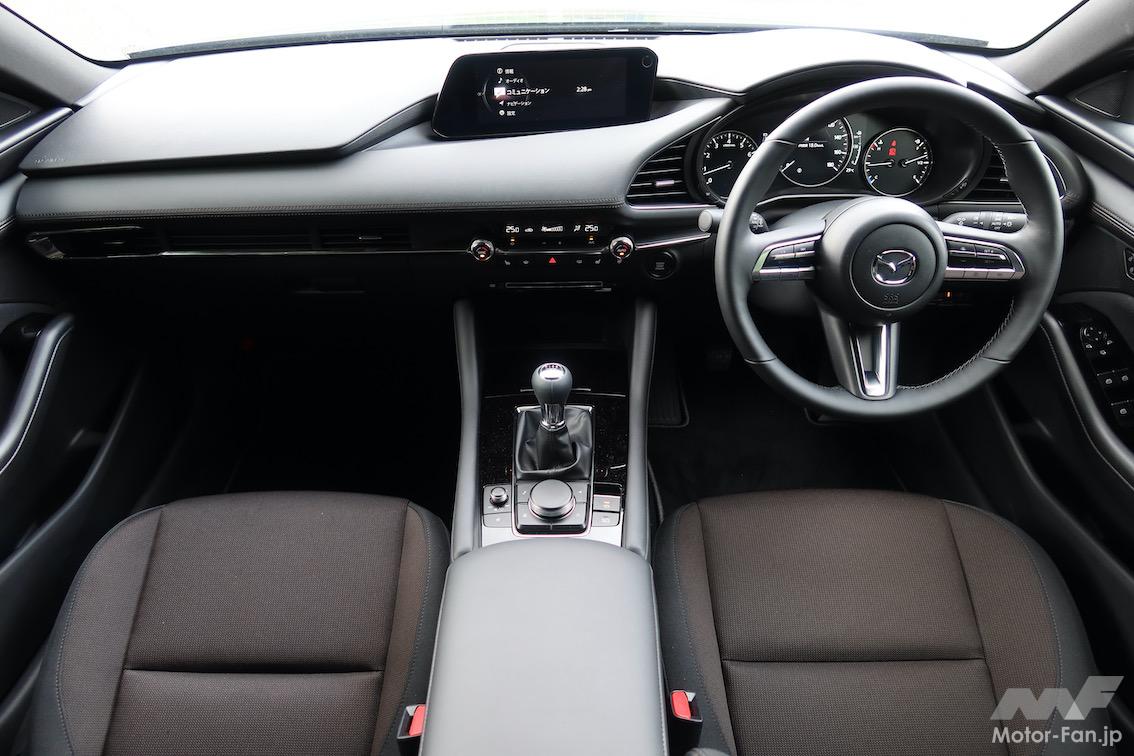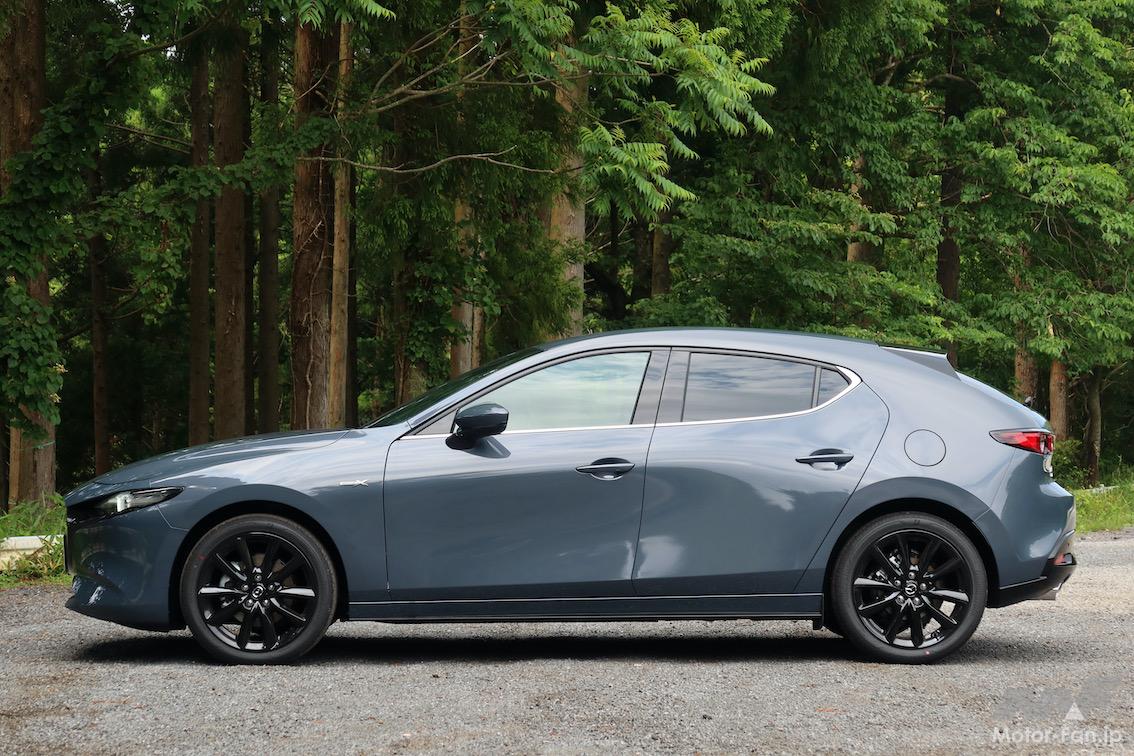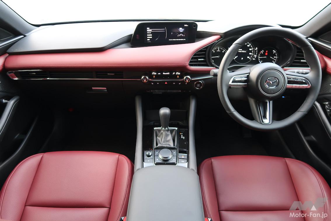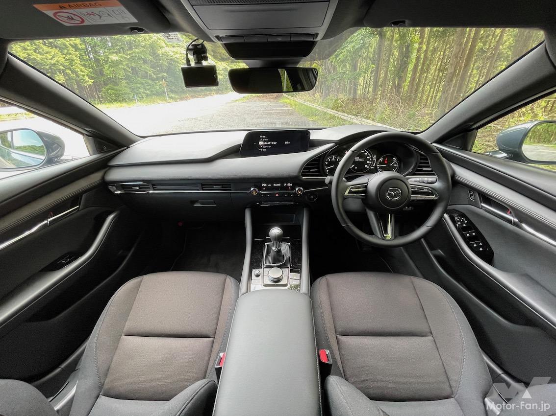 e-SKYACTIV-X搭載車専用の装備は、18インチサイズのアルミホイールがブラックメタリック塗装になることだ。1.5ℓと2.0ℓのガソリン、1.8ℓのディーゼルエンジン搭載車の18インチアルミはグレーメタリック塗装なので、そこが最大の識別点になる。大径マフラーカッターを備えるのもe-SKYACTIV-Xの特徴だが、ひと目で識別できた試しがない。一体どれほど大径なのだろう……。
