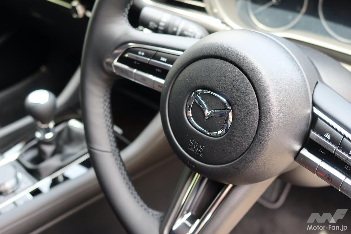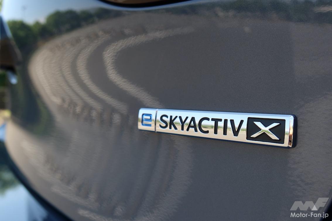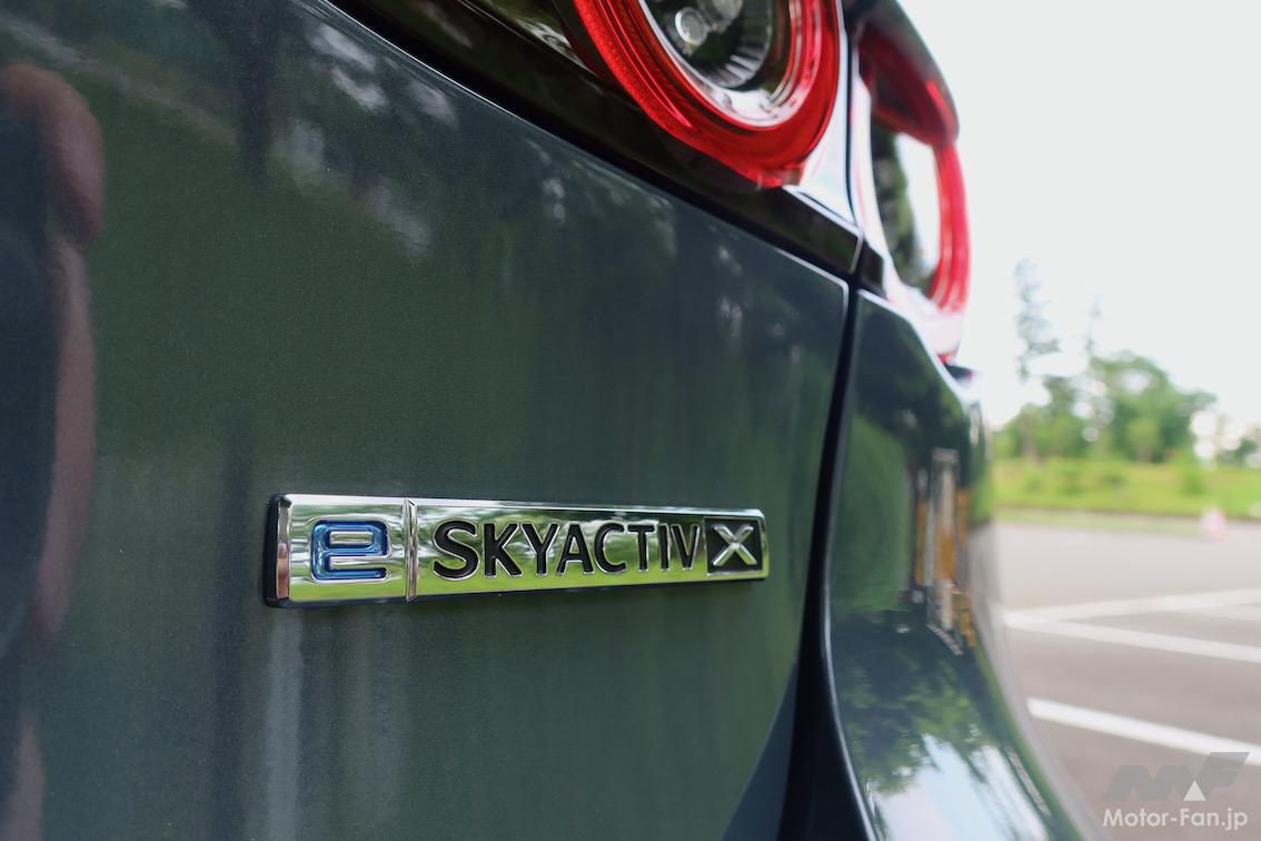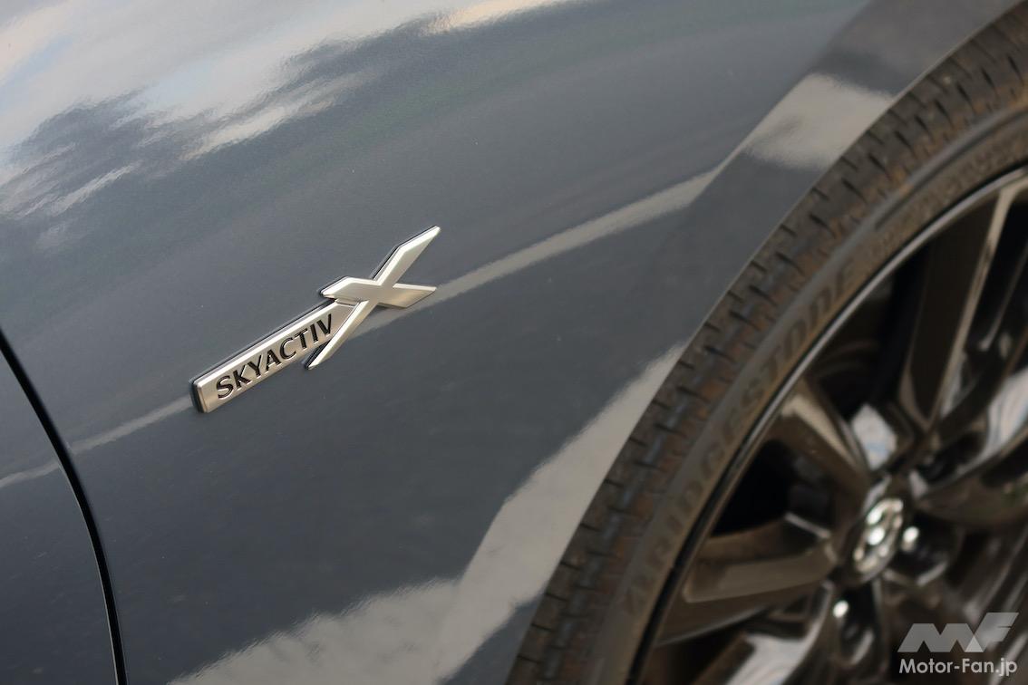 「せっかくX買ったんだからさぁ、もっと差別化してよぉ」という声があったのだろうか。2020年11月の商品改良時に、e-SKYACTIV-X搭載車専用の装備として、フェンダーバッジが追加された。左右のフロントフェンダー上部、フロントドア寄りに「SKYACTIV-X」のバッジが追加されている。デザインの魅力を最大化させるためにルーフアンテナを廃止し、わざわざガラスアンテナを開発したこだわりの持ち主が、「こんな安直なことやる?」というのが正直な感想だ。このクルマの最大のがっかりポイントが、このえげつないフェンダーバッジである。