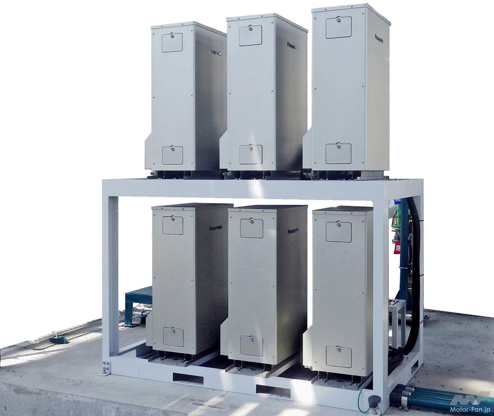 この度、徳山製造所内に設置した実証機は、パナソニックが開発する6台の純水素型燃料電池を1つのユニットに収めたシステム構成になっている。水素の供給配管や熱配管、電力出力ラインなどを集約してユニットに接続し、6台の純水素型燃料電池を1つのシステムとして稼働させる連携制御を実現した。なお、純水素型燃料電池の6台連携制御の実証は国内初(定置用燃料電池システムにおいて、2021年9月14日現在、パナソニック調べ)。
