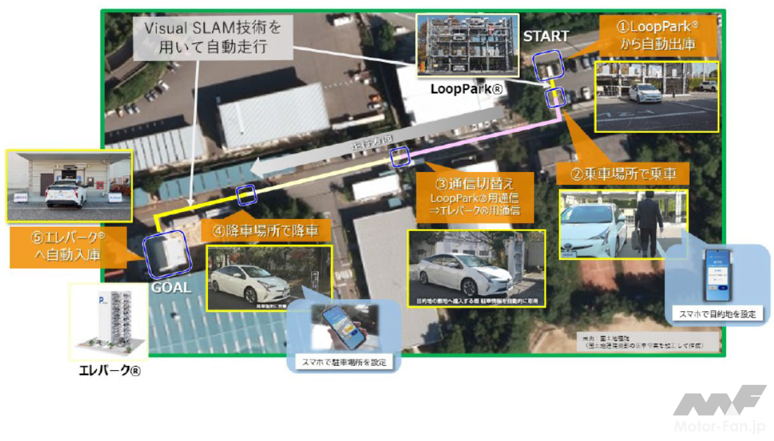 実証実験では、車両と機械式駐車設備に設置したコントロールユニット内にそれぞれの専用アプリを搭載し、連携に関する初期設定を行った後、新明和工業の敷地内に設けた乗降場所から車両アプリ上で目的地を当該機械式駐車設備に指定するだけで、車両アプリと機械式駐車設備アプリが連携し、車両が自動で機械式駐車設備に入出庫できるかの検証を行ったものである。実験結果から、自動運転車両を認識した機械式駐車設備は、新明和工業が開発したシステムにより指定パレットの呼び出しや車両の格納、ゲートの開閉を自動で行い、またアイシンがVisual SLAM*を用いて開発した自動走行および駐車技術を用いて駐車経路を制御し、段差や高い駐車精度が求められる機械式駐車設備に自動駐車することに成功した。