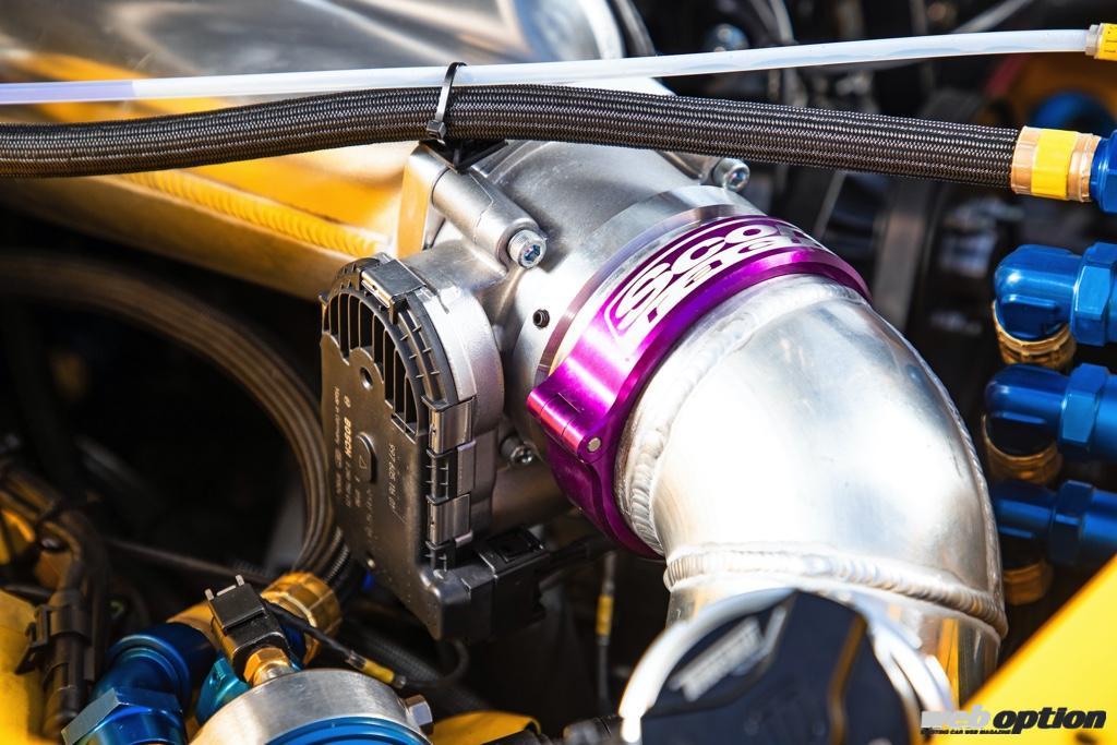 アルコール混合燃料であるE85を使用する独自の燃料システムも構築し、各種制御を司るコンピュータにはモーテックのM800を使用。E85は一般的なガソリンよりもオクタン価が高いので高圧縮にできる一方、理論空燃比は小さくなるので一度に大量に吹く必要がある。そのため2000ccの大容量インジェクターや高圧のフューエルポンプを導入。耐シール性に優れたB&M製のホースを贅沢に使った美しい取り回しも見どころだ。