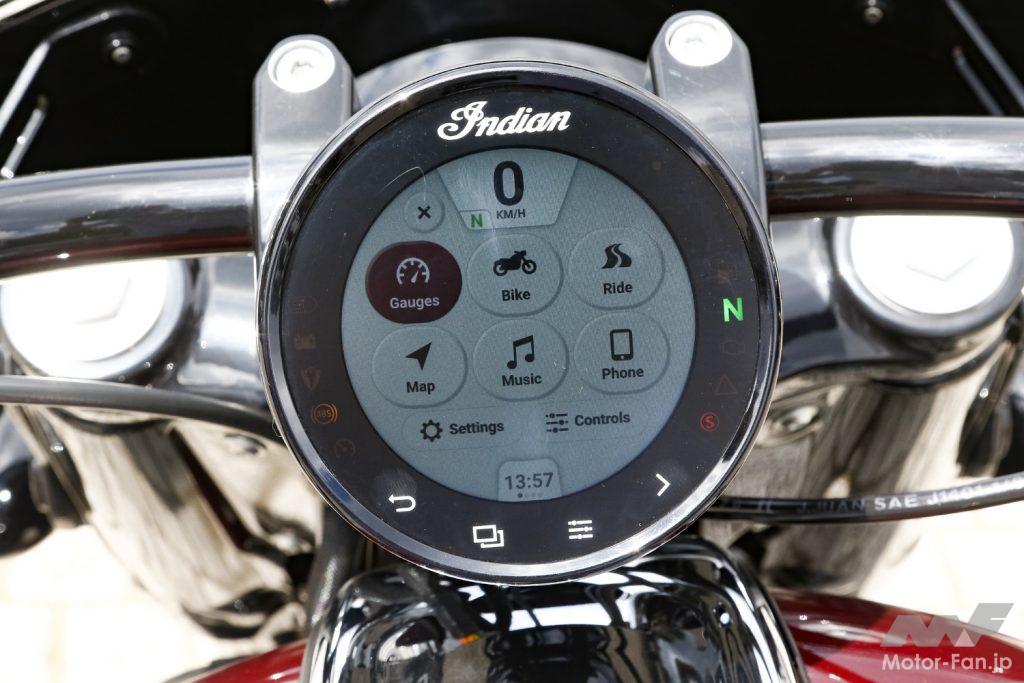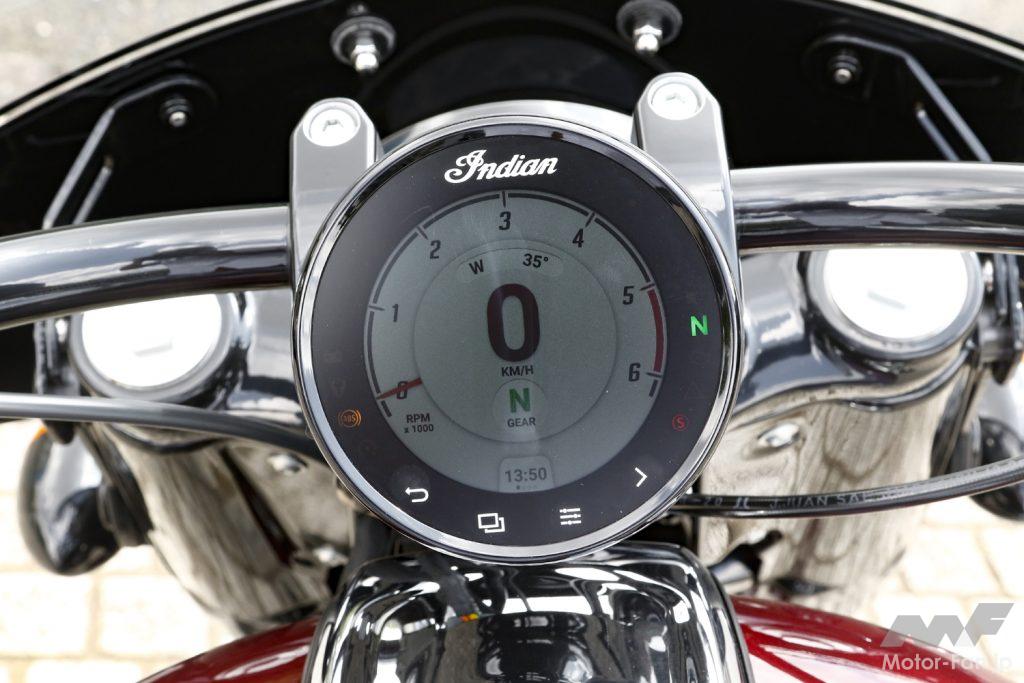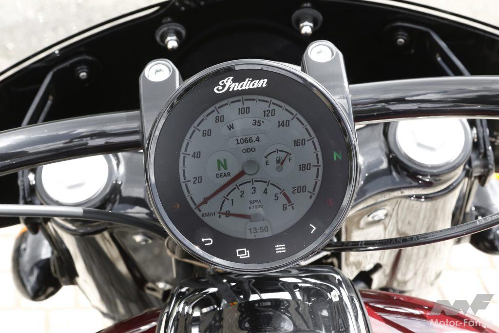 シンプルな4インチ丸型メーターが一つ採用されている。液晶デジタルのタッチスクリーンディスプレイで回転計と速度計、時計や方位計とギヤボジションインジケーターが表示されている。Bluetoothでスマホとの連携にも対応している。