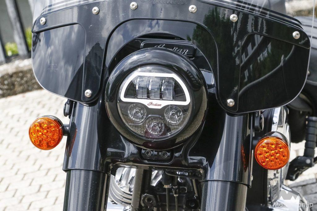 至ってオーソドックスにレイアウトされたフロントマスク。黒いリムの丸型ヘッドランプながら、LEDを使った独自のレンズデザインが最新モデルであることを物語っている。