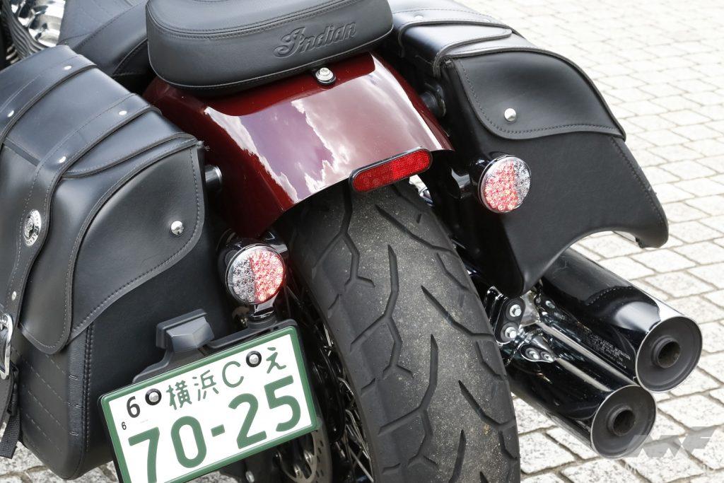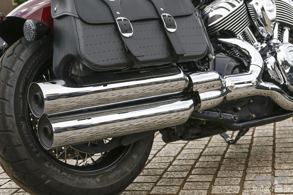 地面と平行、ストレートに伸ばされた右出しツインマフラー。走り去る姿も威風堂々と、良い雰囲気を醸し出している。