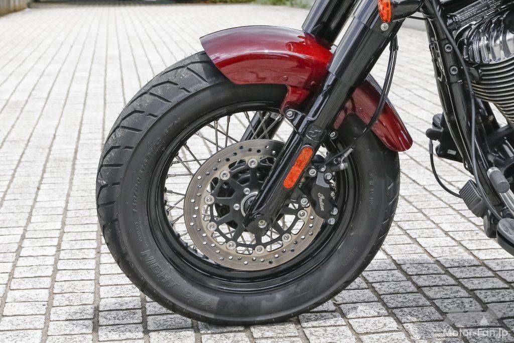 16インチサイズのスポークホイールにはピレリ製NIGHT DRAGONを履く。φ300mmのシングルローターに対向4ピストン油圧キャリパーを採用。