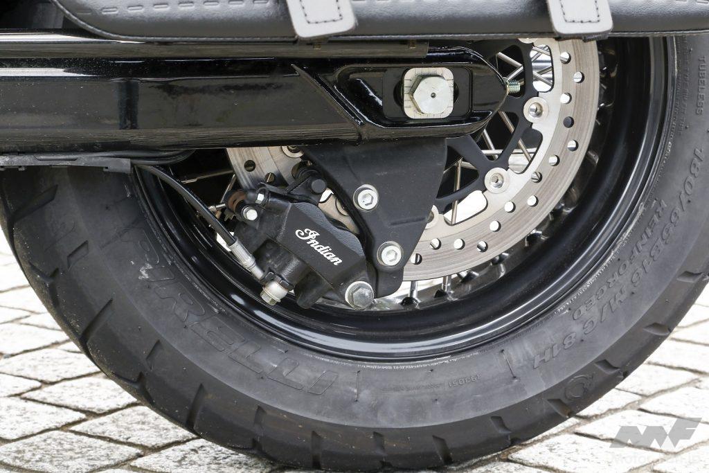 後輪も前輪と同じ16インチサイズのスポークホイールを採用。フローティングマウントされたシングルディスクローターもサイズは前輪と同じφ300mm。油圧キャリパーは2ピストンのピンスライド式だ。