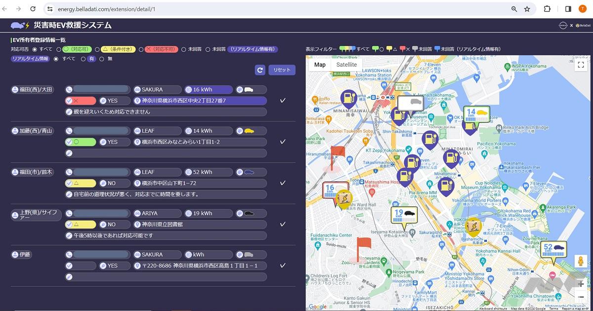 「災害時EV救援アプリ」は、主に災害本部等を擁する自治体向けに開発された。災害時、あらかじめ登録された公用車担当者やEVユーザーにアプリから救援要請が届き、ユーザーがEVの電力残量や位置情報等を回答することで、災害対策本部が避難所へ派遣可能なEVの情報を把握することが可能である。電力を必要としている避難所などの情報と場所、派遣可能なEVの情報を一覧で表示することで、災害対策本部におけるEV派遣場所の迅速な決定を支援する。