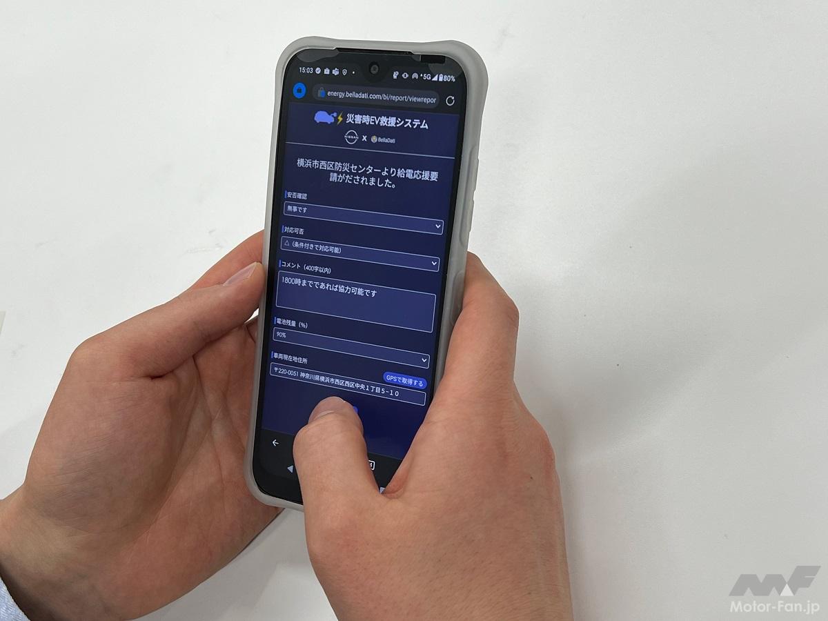 今回、横浜市西区(1/31)で行われた実検証では、災害による停電時を想定して、災害対策本部が本アプリを通して登録されたEVのドライバーに救援依頼を一斉に送信した後、救援依頼を受けた各ドライバーが、現在地や対応可否、電池残量や支援できる時間帯等を回答するとともに、その情報を元に、災害本部より具体的な支援場所を指示するという一連のプロセスが検証された。また、開成町での実検証(2/6)では、実際にEVを派遣し給電までを行う訓練と検証が行われた。