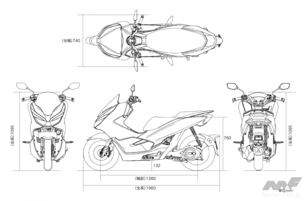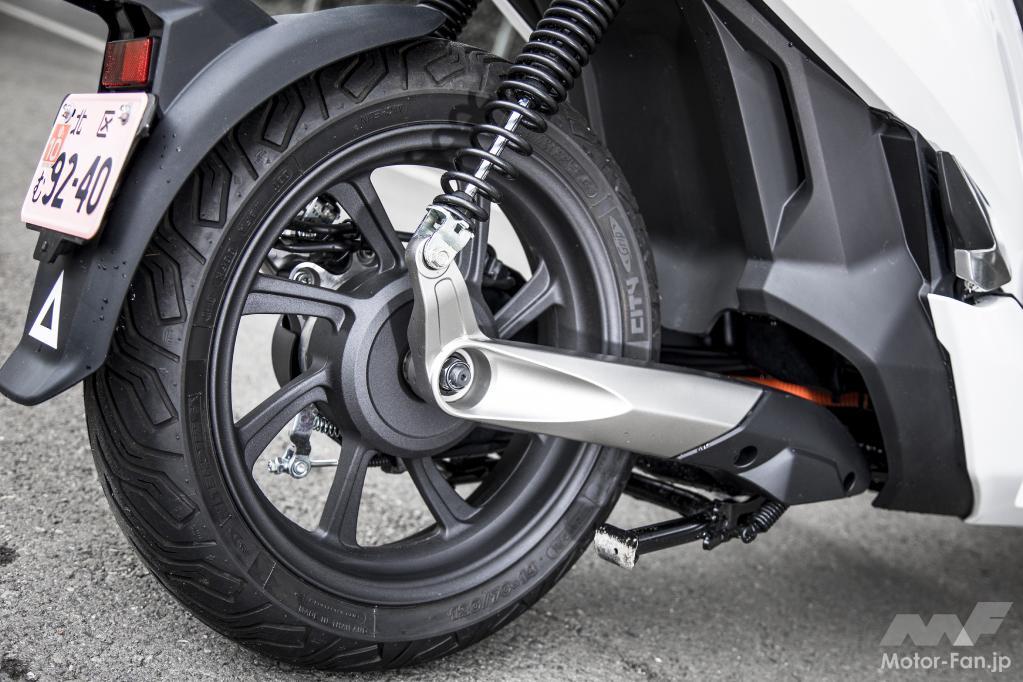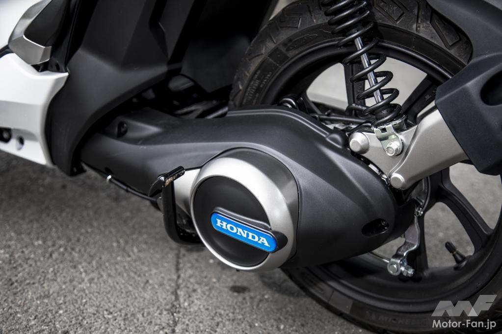 それから四半世紀の歳月を経て登場したPCXエレクトリックは125ccクラスへとスケールアップ。前後に14インチホイールを履き、ホイールベースは1380mmと長めの設定だ。CUV ESとの比較でトルクは倍、定格出力は7割増。一方車重は約1割増の144kgで済んでいる。