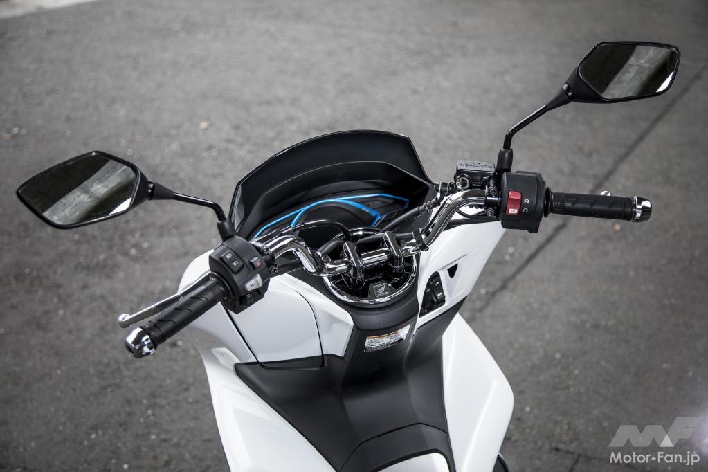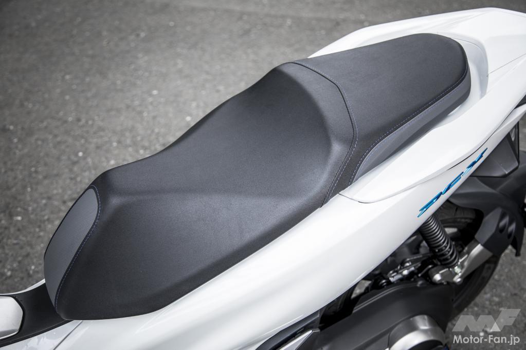 シートに腰をおろすと、PCXよりも車体は少し大柄な雰囲気。大差ないとは言え車重も重め。ひとつ上級の250cc クラスに乗る様な気分だ。でも特に大き過ぎるわけではなく、ちょっと格上の優雅な乗り味が印象深い。