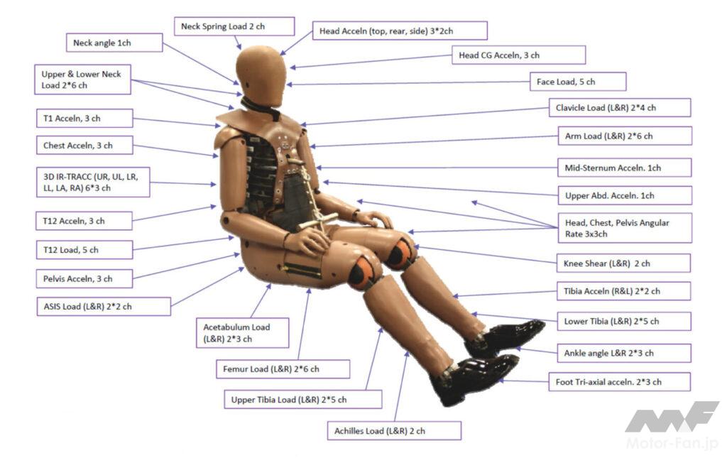 これで何が変わるのかと言えば、人体の表皮と骨格を模したダミーの隅々に荷重計などのセンサーを数多く取り付けられるため、より詳細な人体損傷のデータを収集できるようになる。データ数が多くなれば、それだけ衝突安全対策を緻密にできる。ちなみにTHORは1体1億円以上であり、オプションを追加してゆくとさらに5000万円くらい高くなると言われる。