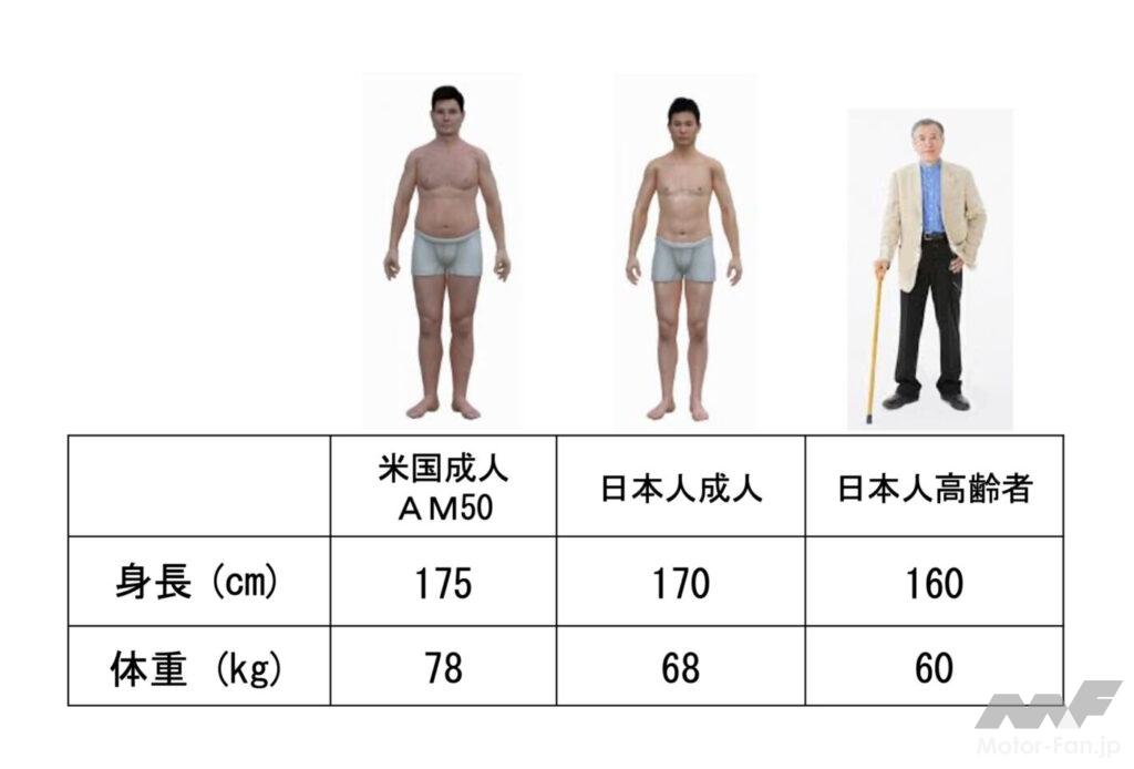 体型を比べてみれば【図7】のような差がある。従来、衝突安全試験ではアメリカ人男性の50パーセンタイル(全サンプルの50パーセントがここに含まれるという意味)をカバーする体型として身長175cm・体重78kgのAM50(アメリカン・マン・50)というダミーが使われてきた。しかし、アメリカ人に比べて小柄な日本人には、このダミーサイズは必ずしも適さない。