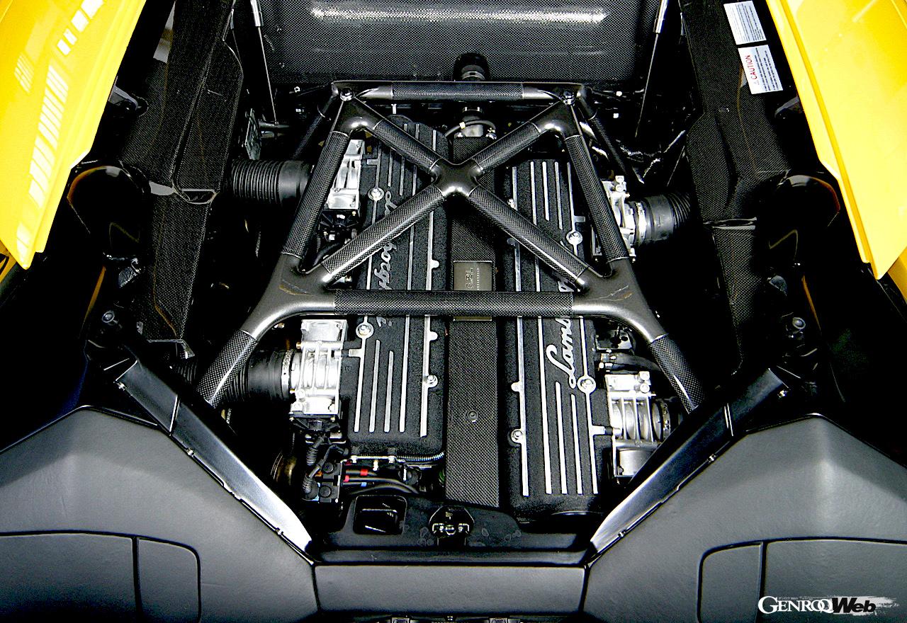 ミッドに搭載されるエンジンは、ディアブロの最終型、6.0のそれからさらにストロークアップすることで6192ccの排気量を得たV型12気筒DOHC48バルブ。吸気システムが前後2系統に分割されたことやバリアブル・ジオメトリー・インテーク・システムを新採用したこと、そして潤滑方式がドライサンプに改められたことなどで、より高性能なエンジンへと進化を果たしている。
