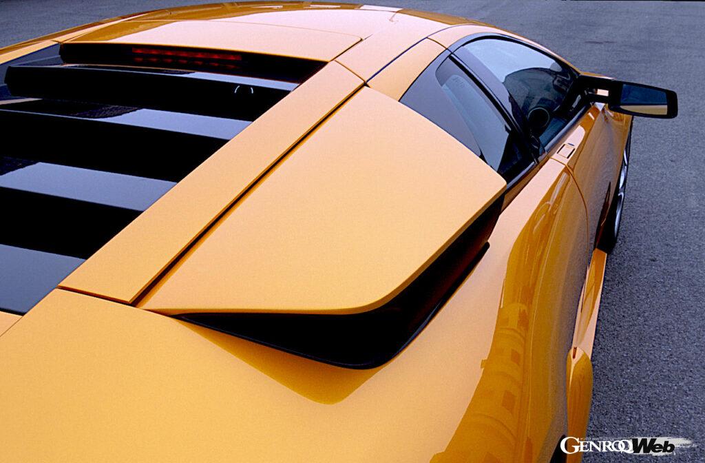 かつてのカウンタックを連想させるリヤセクションのフィニッシュや、ディアブロの面影を残すダイナミックなシルエット、リヤピラーにはバリアブル・エアフロー・クーリング・システムと呼ばれる可変エアインテークが採用されており、これもまたオープン時にはカウンタックを彷彿させる。リヤウイングは速度可変式となり、220km/h以上の速度域では最大値の70度までライズアップする仕組みとなっている。