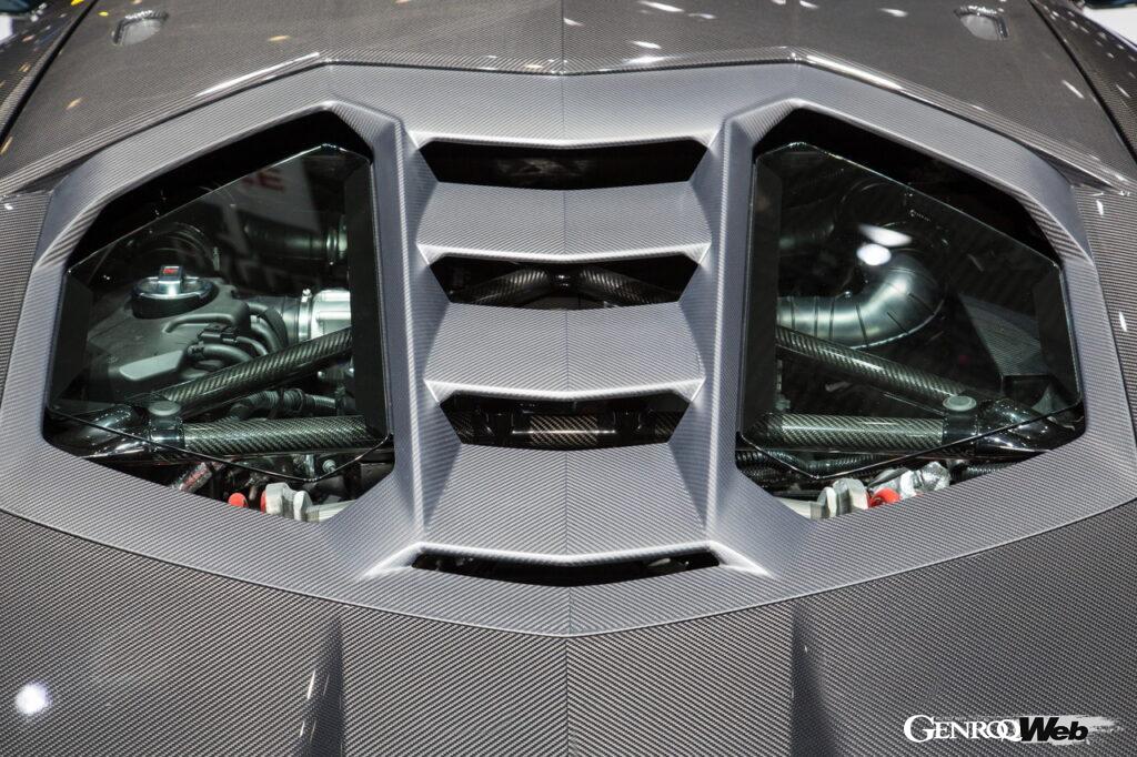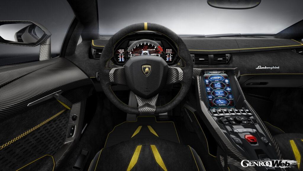 ミッドに搭載されるエンジンは、アヴェンタドールS用の6.5リッター版V型12気筒をベースとした770PS仕様。したがってパワー・ウエイト・レシオは1.97kg/PSという数字になる。トランスミッションは7速ISR、駆動方式は電子制御多板クラッチによるフルタイム4WDと、パワートレインの構成はアヴェンタドールSと変わらない。