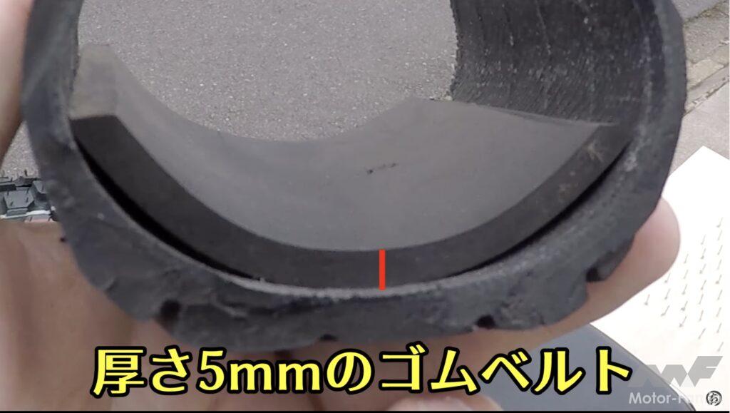 動画では中島さんがパンクする原理を教えてくれている。細かな数字などは動画で確認してほしいが、要するに釘などをタイヤが踏んだ場合、速度によりタイヤのトレッドを貫通する時間が判明しているそうだ。この原理をもとにタイヤに刺さった釘がトレッド面に食い込む時間を稼げば、釘が貫通しないで済む。そのためにタイヤ裏側に5mm厚としたゴムベルトを貼り付けたというわけなのだ。