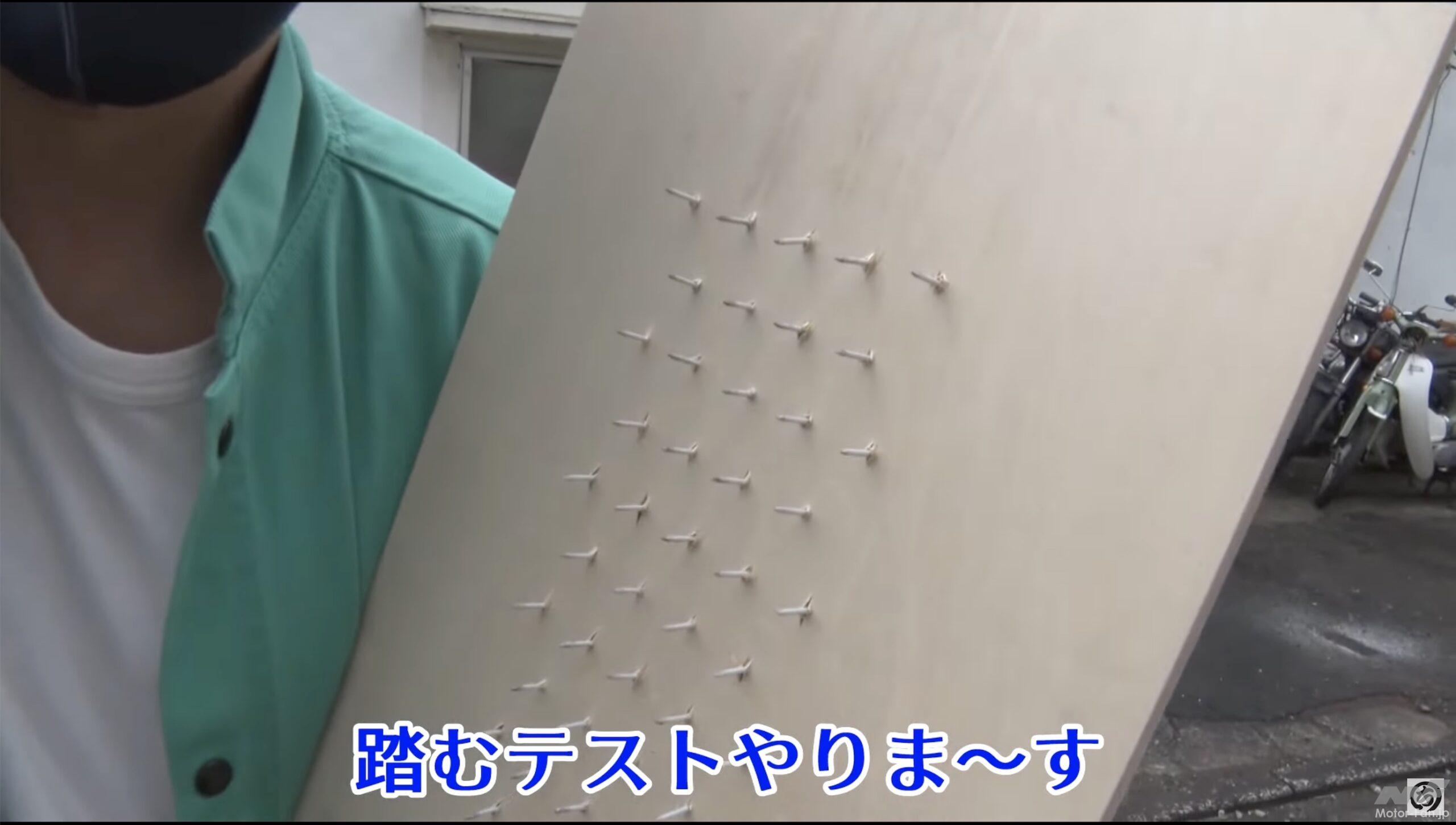 パンクしない(しづらい)タイヤということで、編集長のチャボが用意したのが画像の踏み板。なんとケンザンのように釘を無数に打ち付けてある板なのだ。この上をパンクしない(しづらい)タイヤを装着したスーパーカブで走破する実験を試みようというのだ。