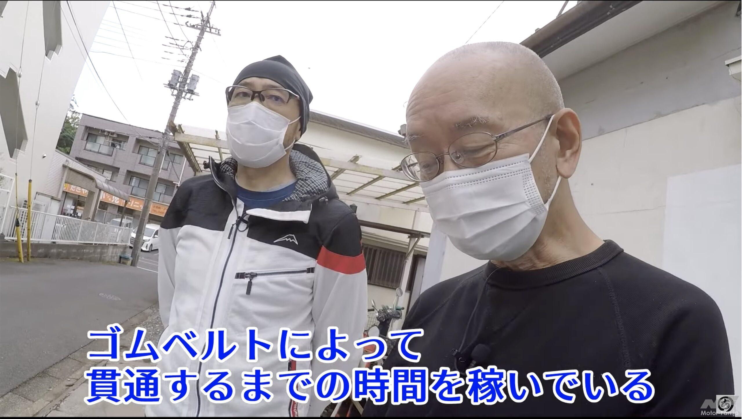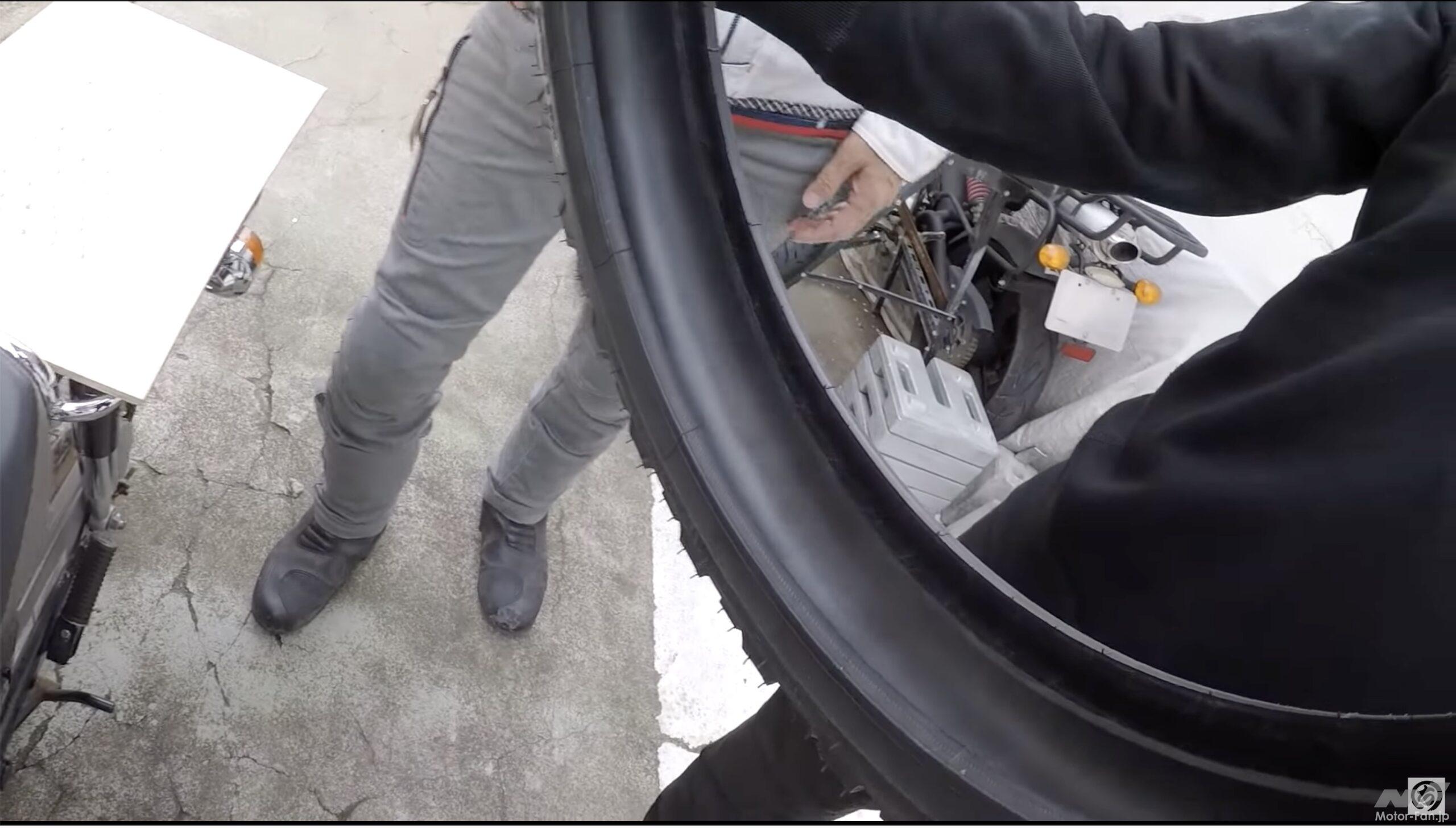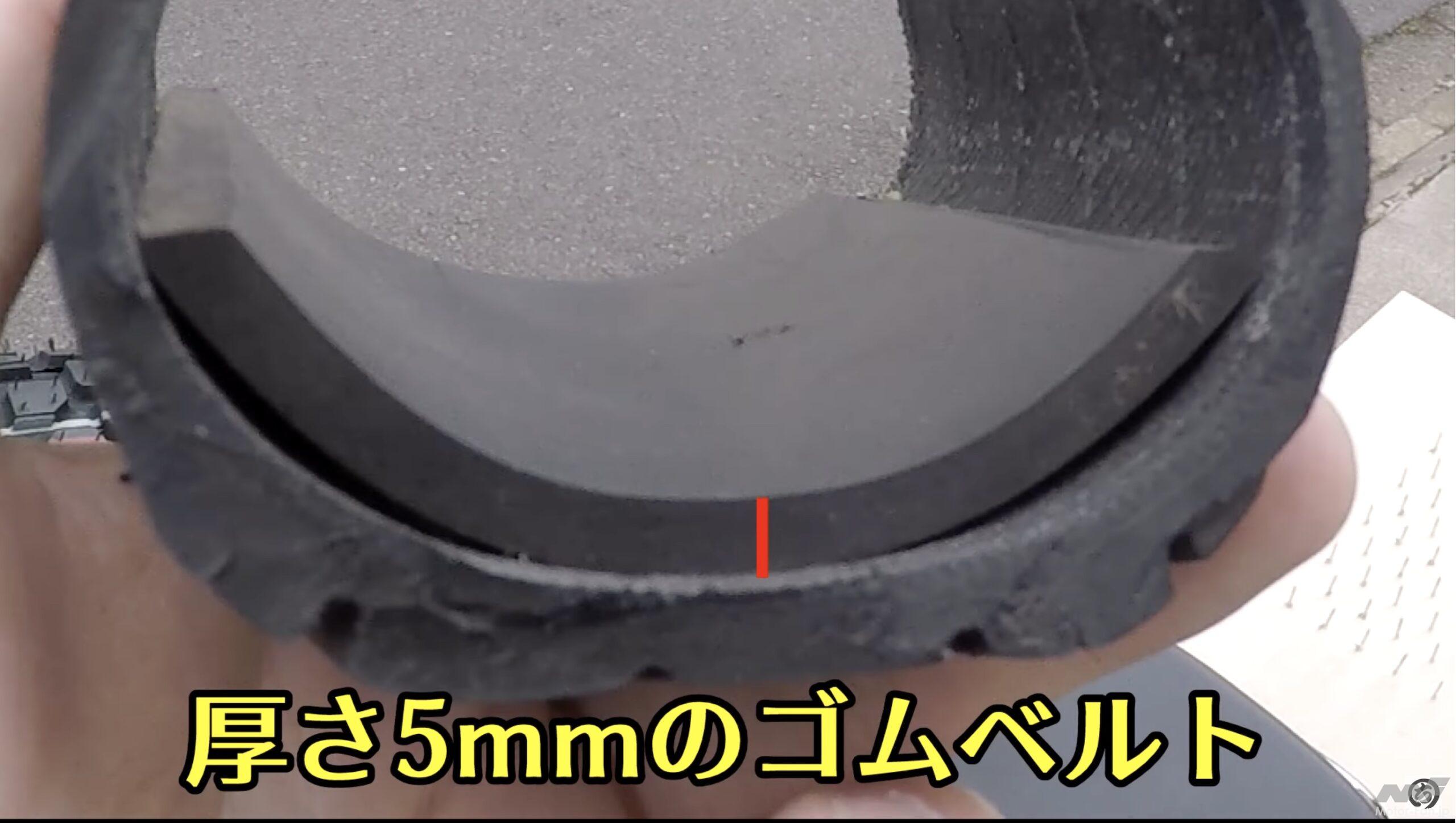 動画では中島さんがパンクする原理を教えてくれている。細かな数字などは動画で確認してほしいが、要するに釘などをタイヤが踏んだ場合、速度によりタイヤのトレッドを貫通する時間が判明しているそうだ。この原理をもとにタイヤに刺さった釘がトレッド面に食い込む時間を稼げば、釘が貫通しないで済む。そのためにタイヤ裏側に5mm厚としたゴムベルトを貼り付けたというわけなのだ。