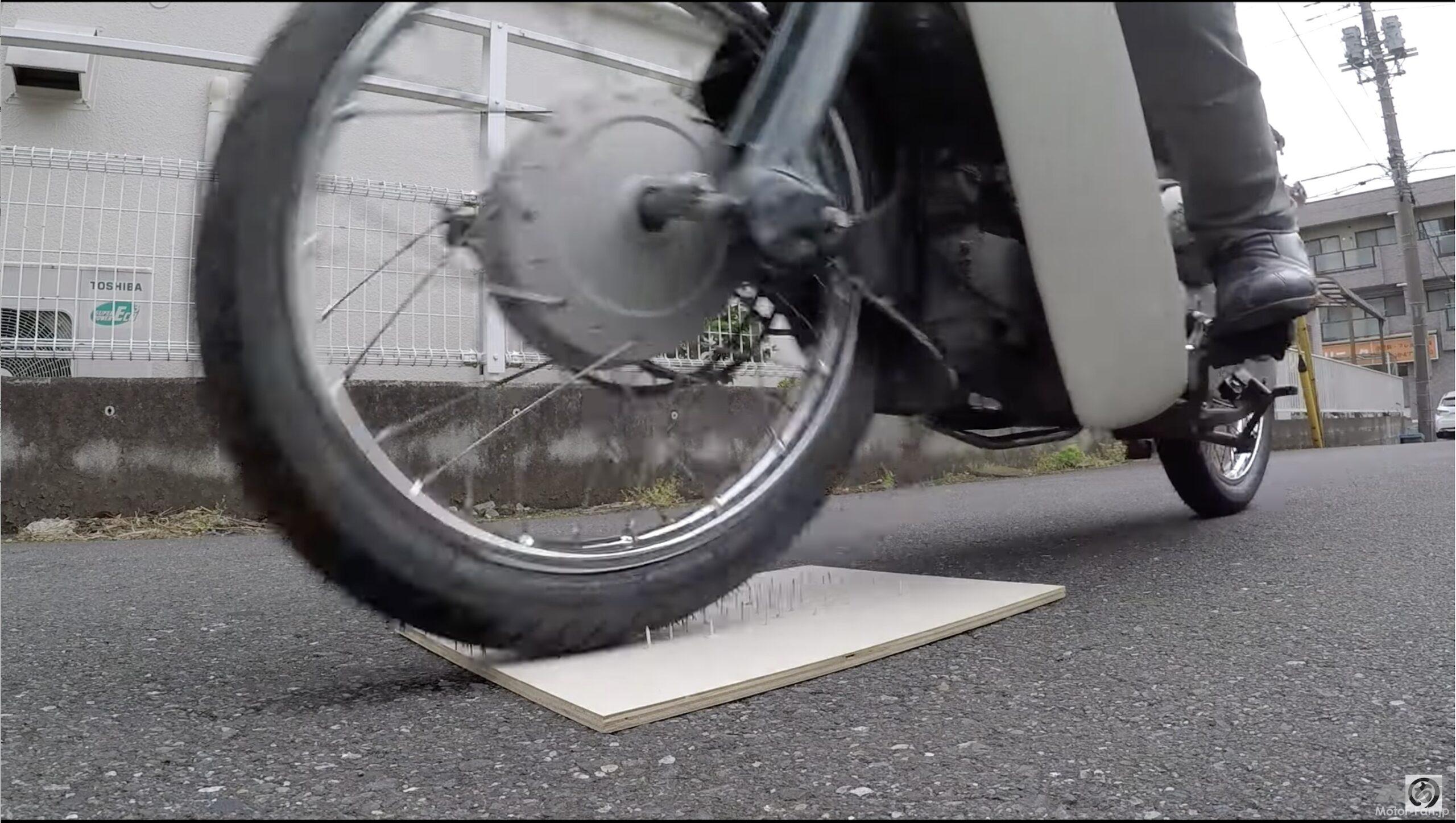 パンクしない(しづらい)タイヤの原理を勉強した後は、いよいよケニー佐川のライディングにより釘を打ち付けた板の上をスーパーカブで走破する実験だ。釘のジャングルを前に緊張するケニー佐川。果たしてカブのタイヤはパンクしてしまうのか、それともパンクしないのか?