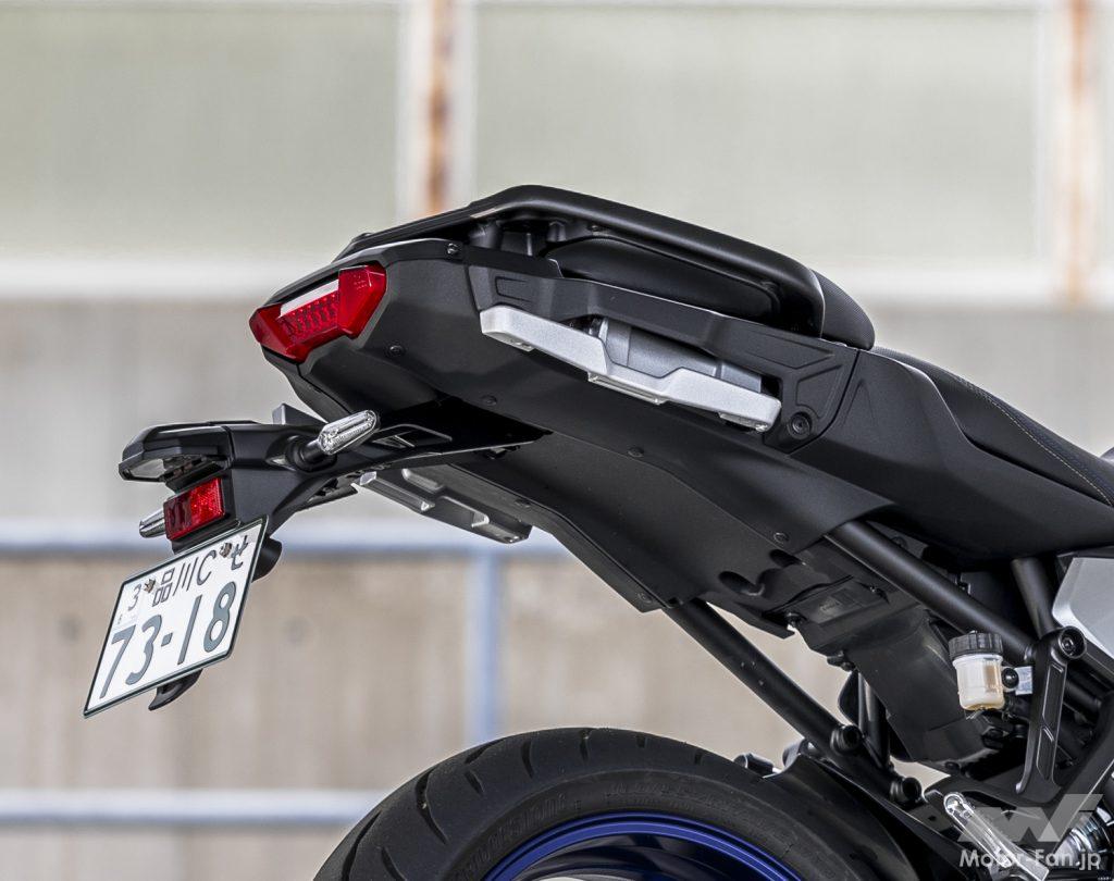 リヤフレームは専用設計されている。後席用のスペースもしっかりと確保され、シートクッションにも厚みがある。シート両脇のグラブバーも堅牢なデザイン。オプションのサイドケース取付け用ステーはダンパー内蔵式だ。