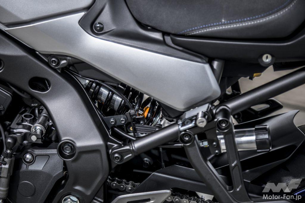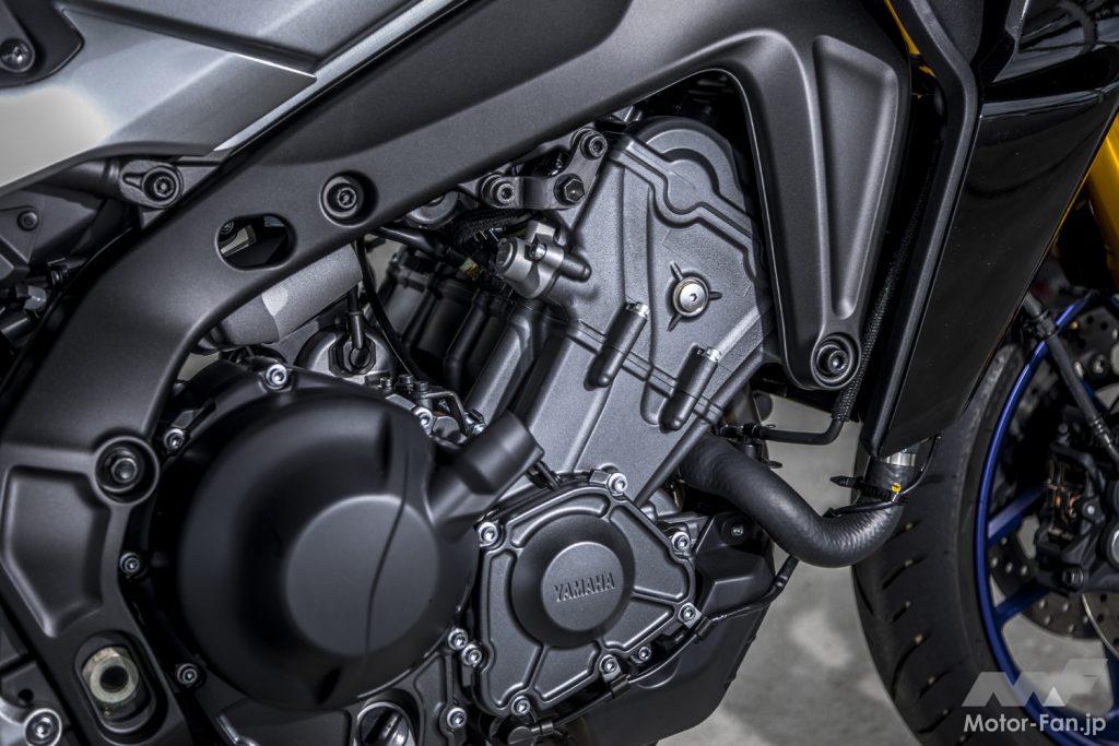 直(並)列3気筒の水冷888ccエンジンはMT-09と共通。新設計されたアルミダイキャスト製フレームはダイヤモンド式で、エンジンはリジッドマウントされている。