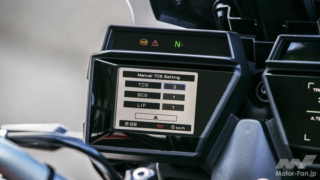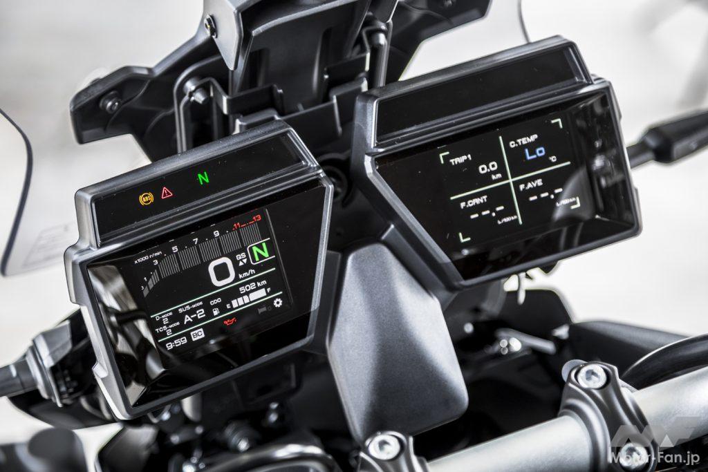 新設計されたフロントのクリアスクリーンは5mm毎に10段階の高さ調節ができる。左右にセパレートされたLED式のツインヘッドランプは、ハイ/ロー別体式。バンク角に応じて照射エリアが広がるコーナリングランプも装備されている。