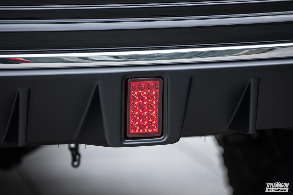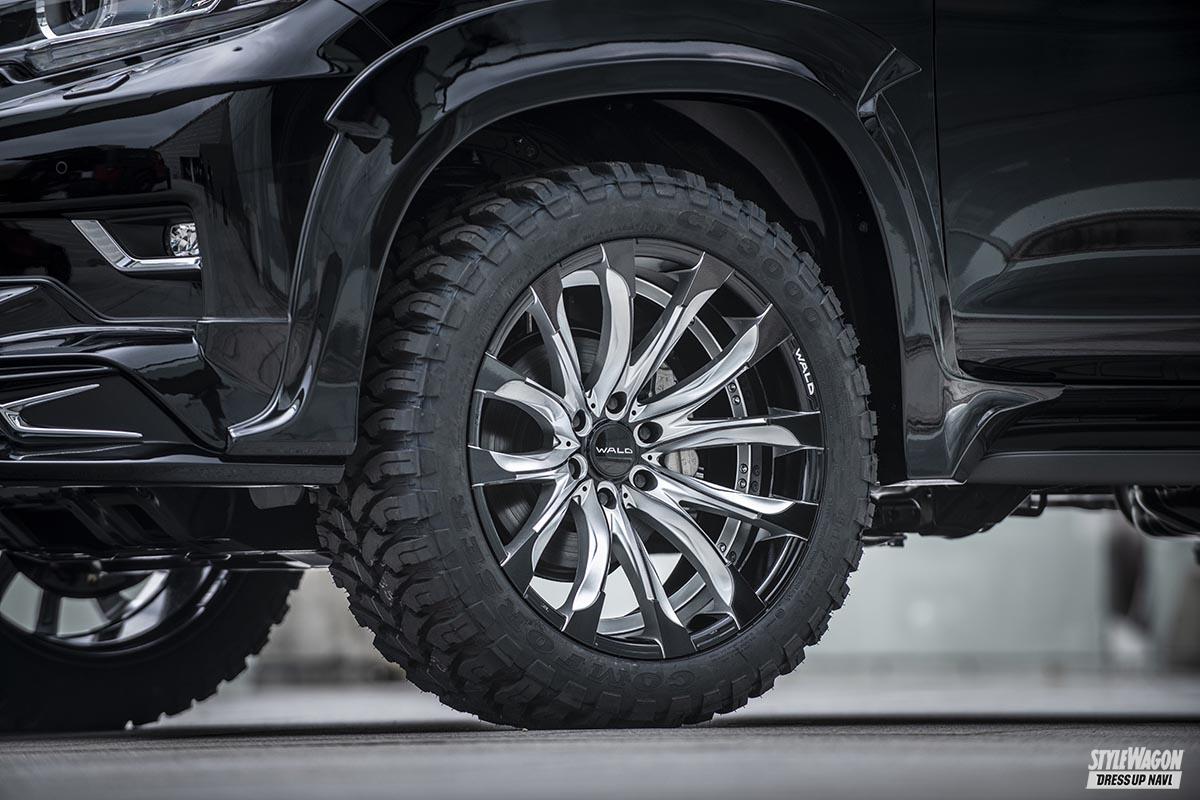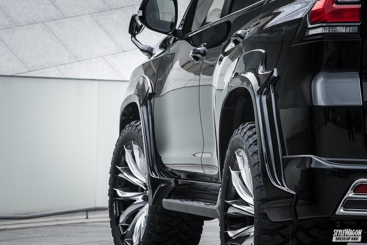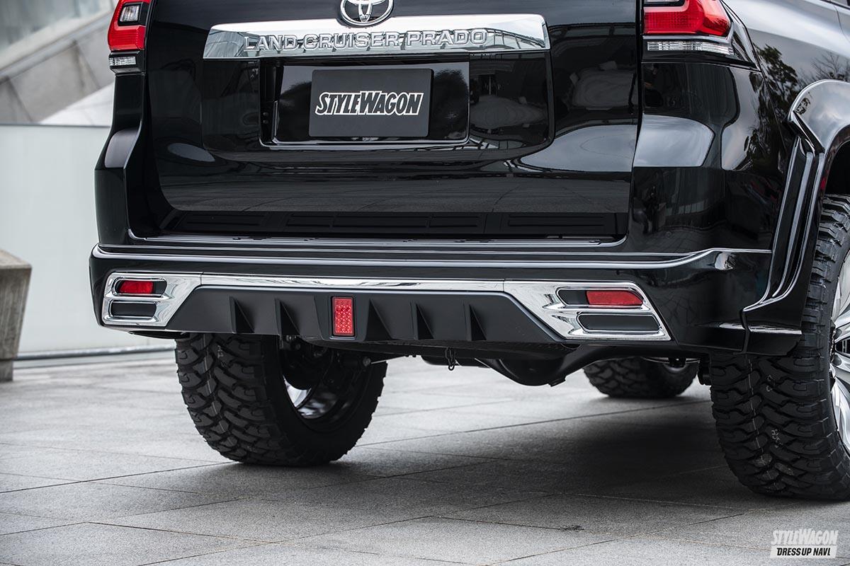 フロントはブレード状で、リアは反射板を取り囲むようなブリッジ状でと、遠目からでもメッキの存在は強く、圧倒的だ。併せて注目したいのがその足元。45㎜フェンダーが飲み込む、荒々しい大口径もオリジナル。デモカーはマイナスインセットに極太タイヤをインし、他を圧倒。プラドの新たな魅力を引き出すことに成功している。