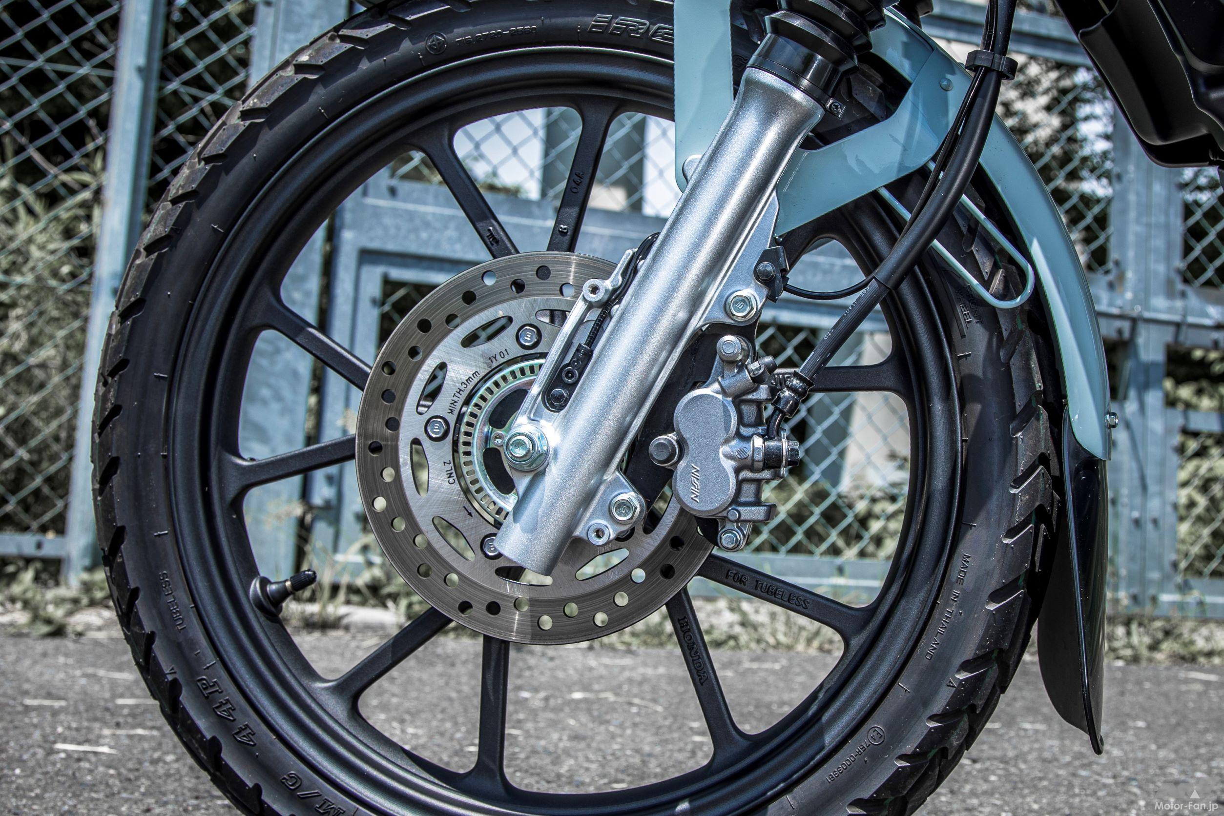 標準装着のフロントタイヤはIRCのNF63B Yで、サイズは70/90-17。フロントキャリパーはニッシンの片押し式シングルピストン。ホイールは全ての車体色でシルバーを採用する。