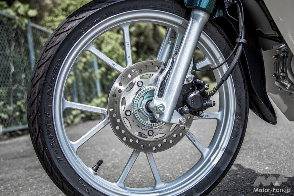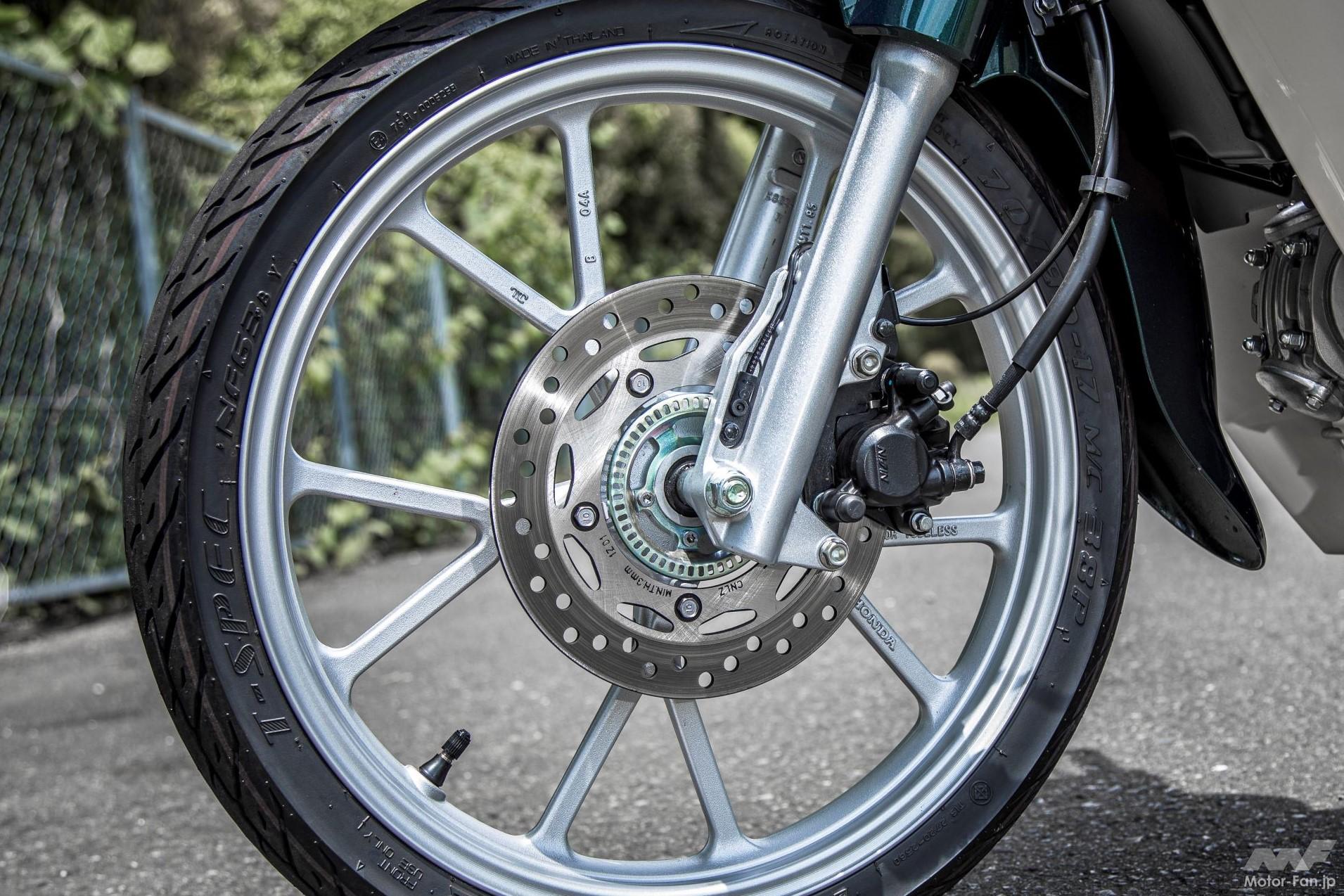 フロントブレーキは新型で両車ともディスク化され、キャリパーはスーパーカブが片押し式シングルピストン、クロスカブは2ピストンとなっている。これによりタッチの差別化が図られており、スーパーカブはドラム時代を彷彿させるソフトな初期フィール、クロスカブはカッチリとした利き味となっている。車両の特性に合わせてこうした細かい部分にも差別化を図るあたり、カブシリーズが開発者にも愛されていることが伝わってこよう。