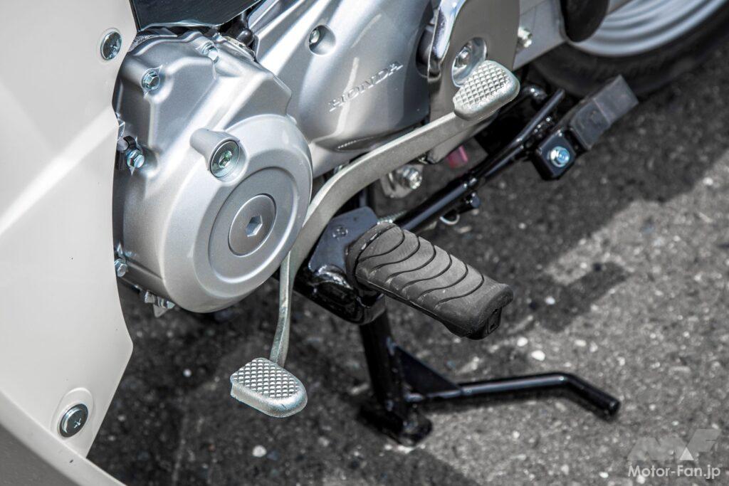 スーパーカブ110のステップは固定式。シフトペダルは伝統のシーソー式だ。