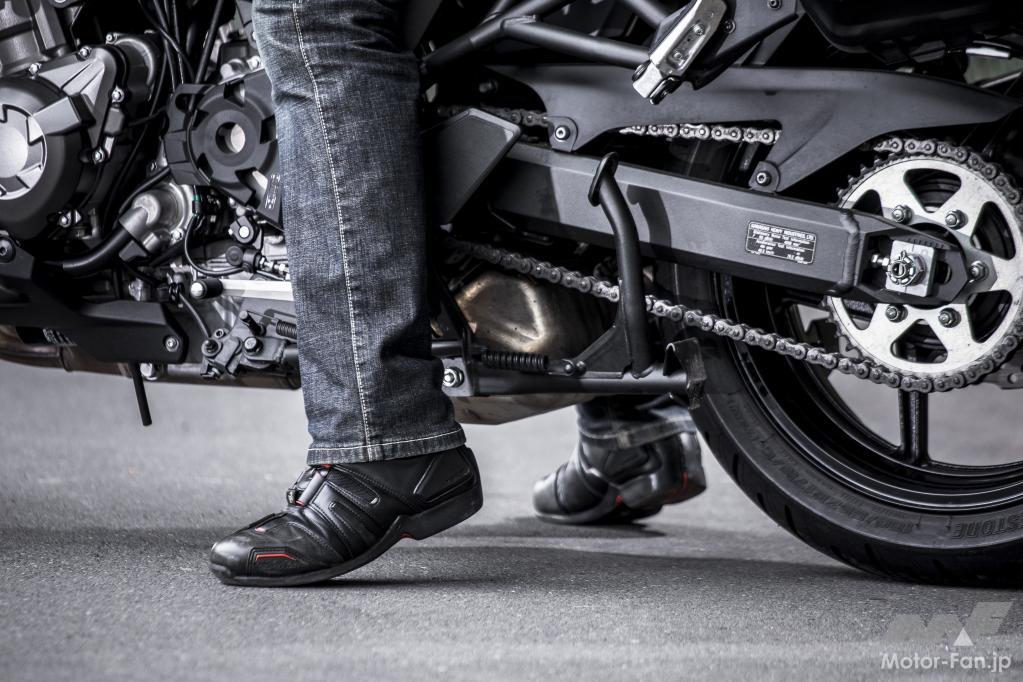 両足の踵が浮いた状態なので、跨がったままバックするのは少々辛い。舗装路の平地なら何とかなるが、足場が悪かったり傾斜があるとバイクから降りて押すことになるので、バックギヤが欲しいと思う場面もあった。