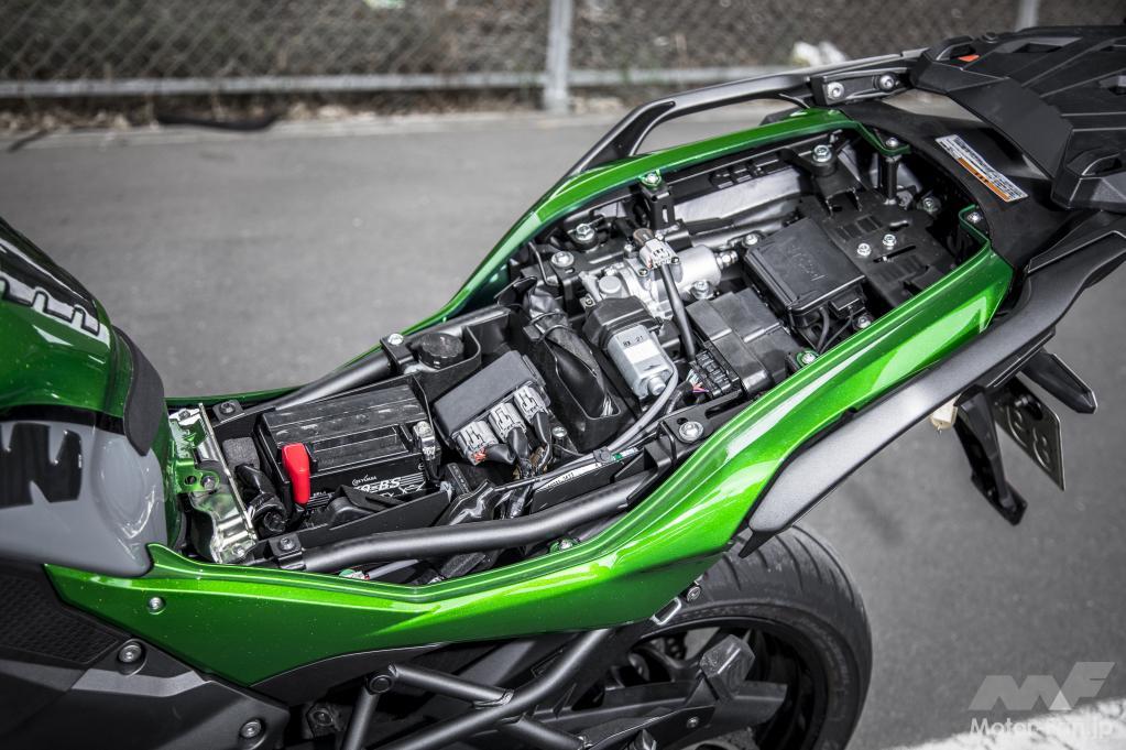 ブルートゥースでスマホと連携できるRIDEOLOGY アプリにも対応。スロットルバイワイヤーによる、いわゆる電子スロットル方式を採用。サスペンションも電子制御式等、カワサキが持つ先進電子制御技術の導入でもリーディングモデルなのである。